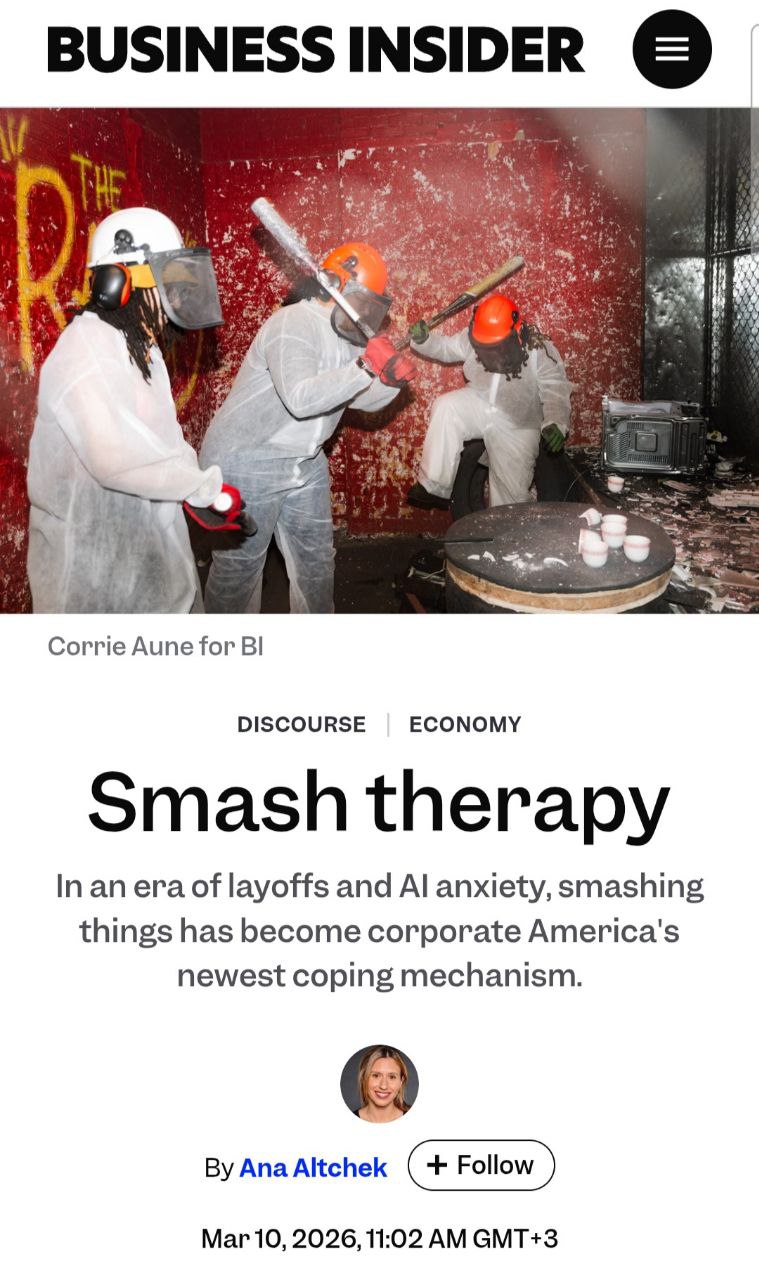 По словам одного из владельцев сети комнат ярости, с января 2026-го клиенты стали нередко брать корпоративные заказы: за 520 баксов в их распоряжении оказывается комната, которая имитирует офис, а ломать можно всё, что попадётся на глаза. Кто-то вообще приходит с фоткой начальника или распечатками рабочих имейлов чтобы превратить бумагу в конфетти.