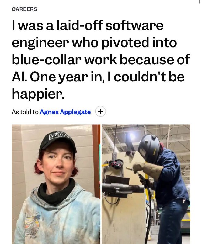 История дня: айтишницу из Штатов уволили из-за ИИ, поэтому она стала сварщицей и теперь чувствует себя счастливее, чем на прошлой работе.