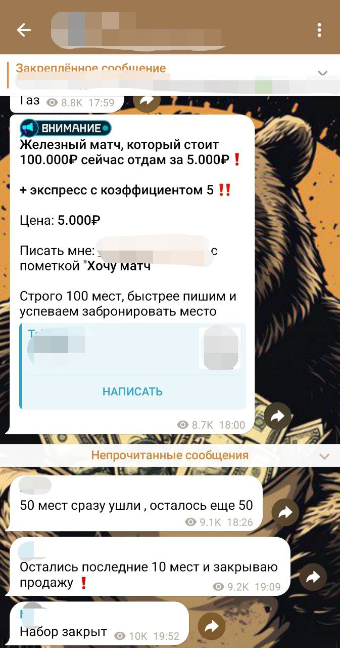 тип продает железный матч за 100 000₽, мол он обладает ахуенный информацией и знает исход. Периодически продает такую инфу не за 100к, а всего лишь за 5000₽, разумеется по предоплате. Самое интересное, что ставки он даёт на крупные рынки, где лимиты достаточно высокие, типа Турнир Большого Шлема, Лига Чемпионов, КХЛ и тд. Статистика по таким железным матчам: 1211+ 26-.