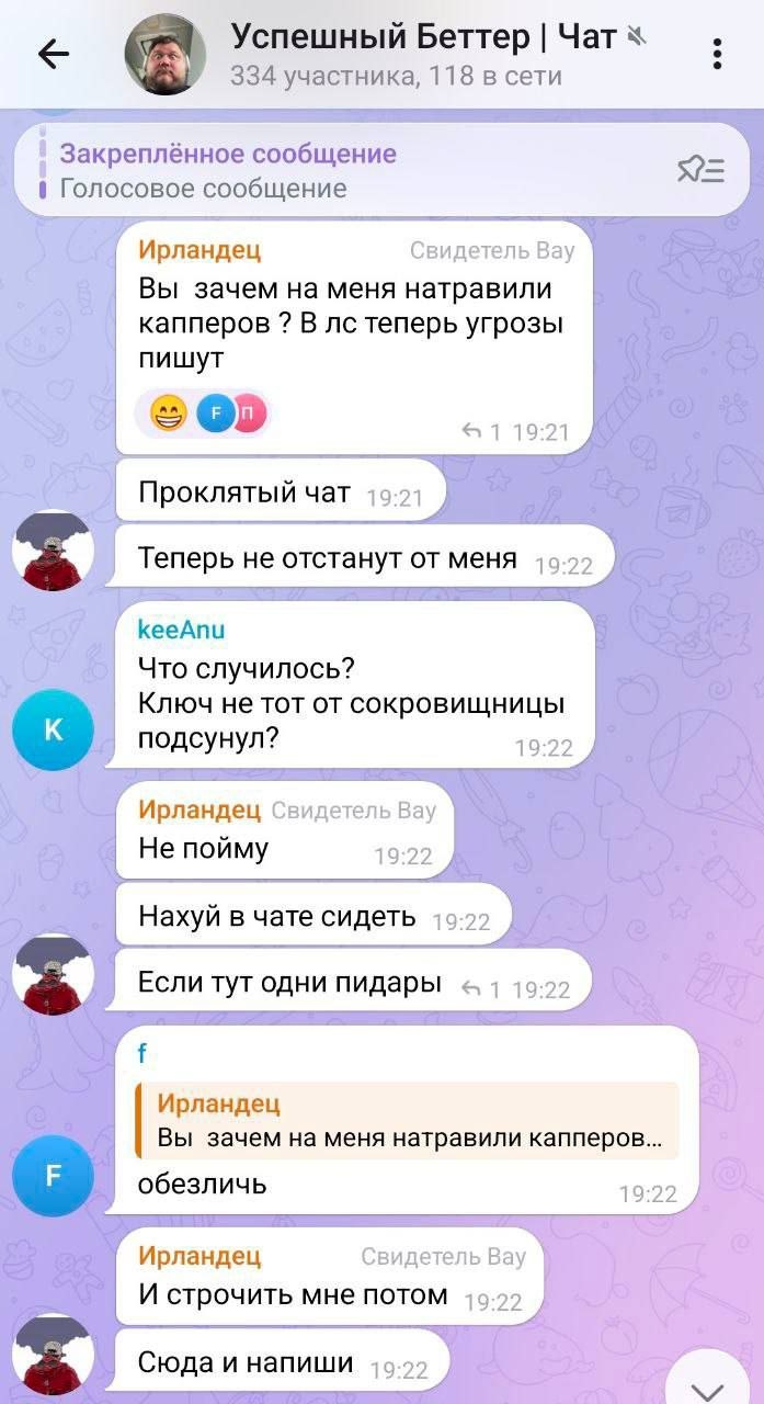 Человек с ником «Ирландец» (не ищите сходств с Фрэнком Шираном, потому что их ровно 0) в чате назвал меня кидком и, что, якобы, знает за меня. Разумеется, я написал ему в личку, дабы поинтересоваться, с чего он это взял. Но это трусливое интернет-создание, конечно же, кинуло меня в ЧС, увидев какие-то угрозы с моей стороны и побоявшись объяснить всё один на один... Ещё одна из причин, что сказать было нечего, но ведь только мужчина перед мужчиной может извиниться, если был не прав, но не маменький мальчик🙌