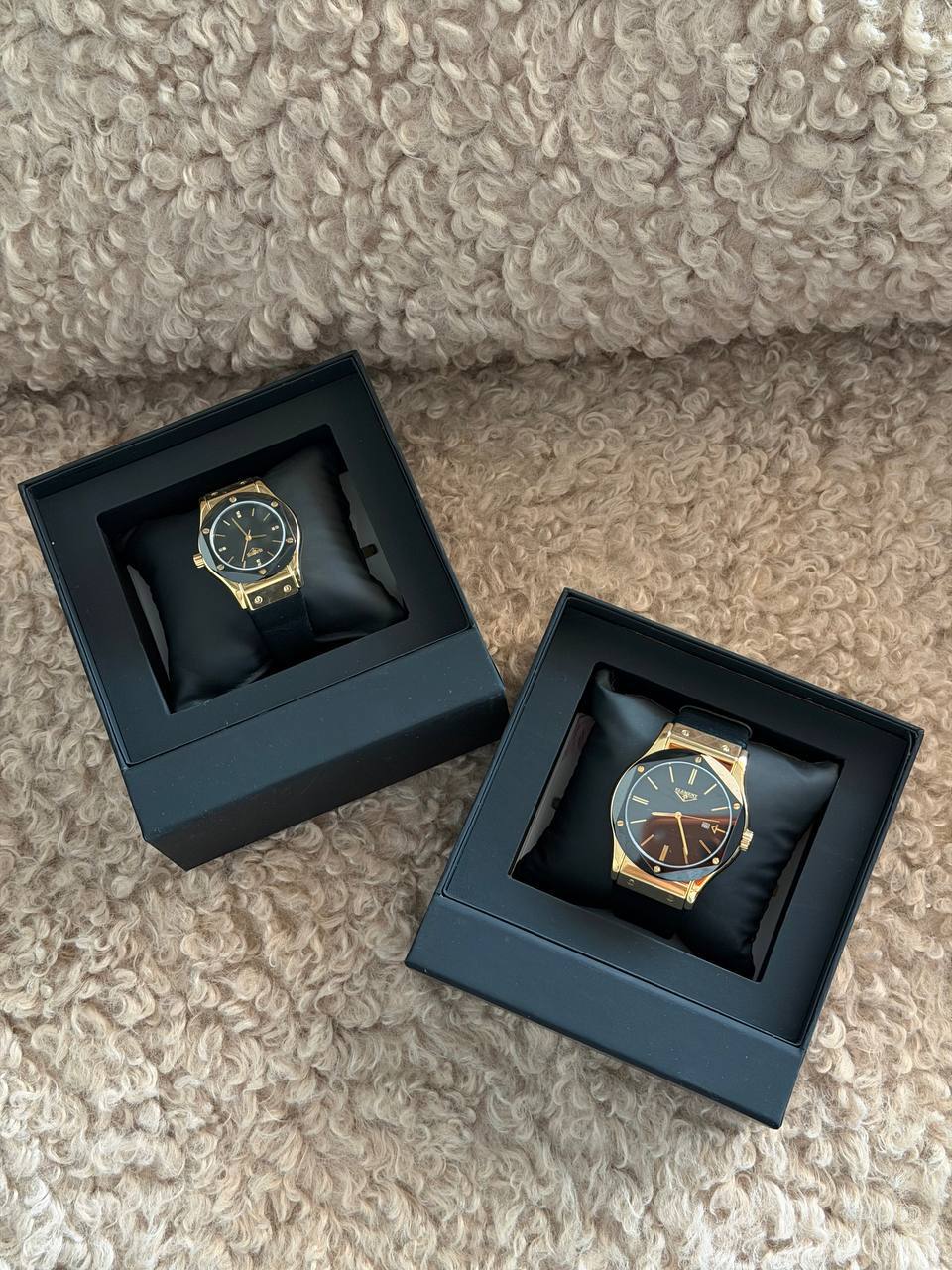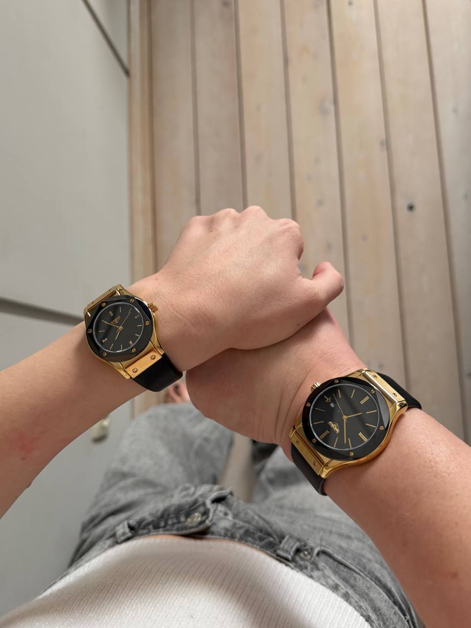 Я выбрала часы от бренда 33 Element. Швейцарский бренд, у которого много именно парных решений. Черные часы с золотыми вставками. Любуюсь, мамочки!))