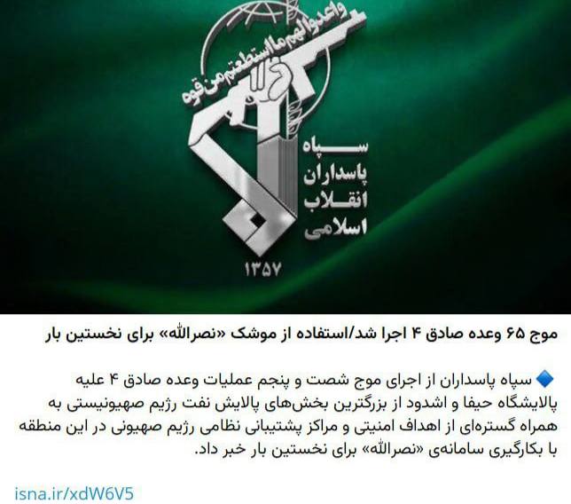 Корпус вартових Ісламської революції заявив, що нафтопереробний завод у Хайфі був атакований новою ракетою «Насралла», названою на честь загиблого лідера «Хезболли», яку Іран вперше застосував у бойових діях.