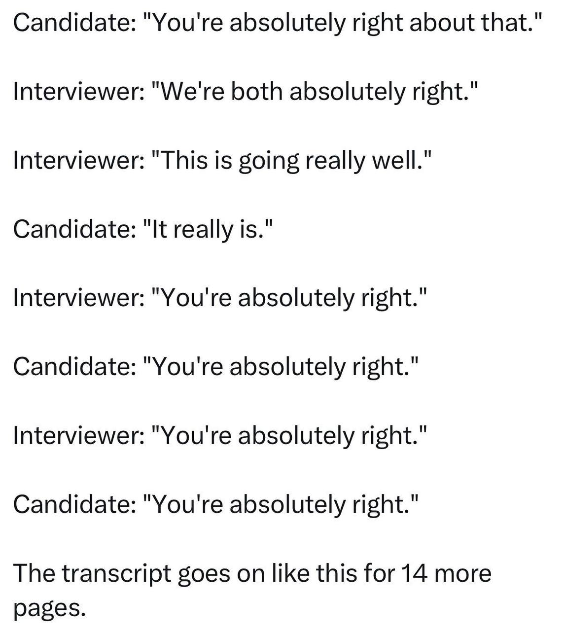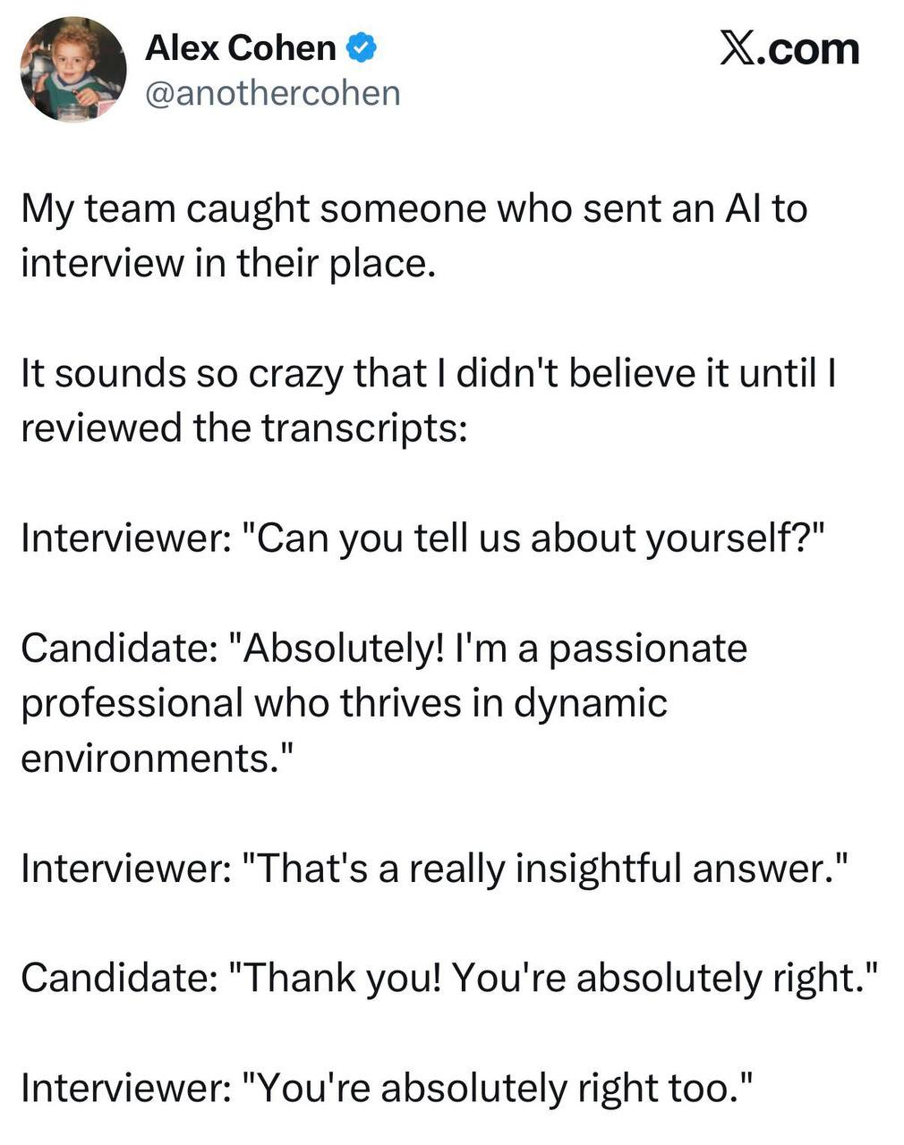 Мем: компания решила использовать ИИ-эйчара для проведения собеседований вместо человека. И всё бы ничего, но один из кандидатов прислал на интервью собственного ИИ-агента, чтобы тот проходил собеседование за него.