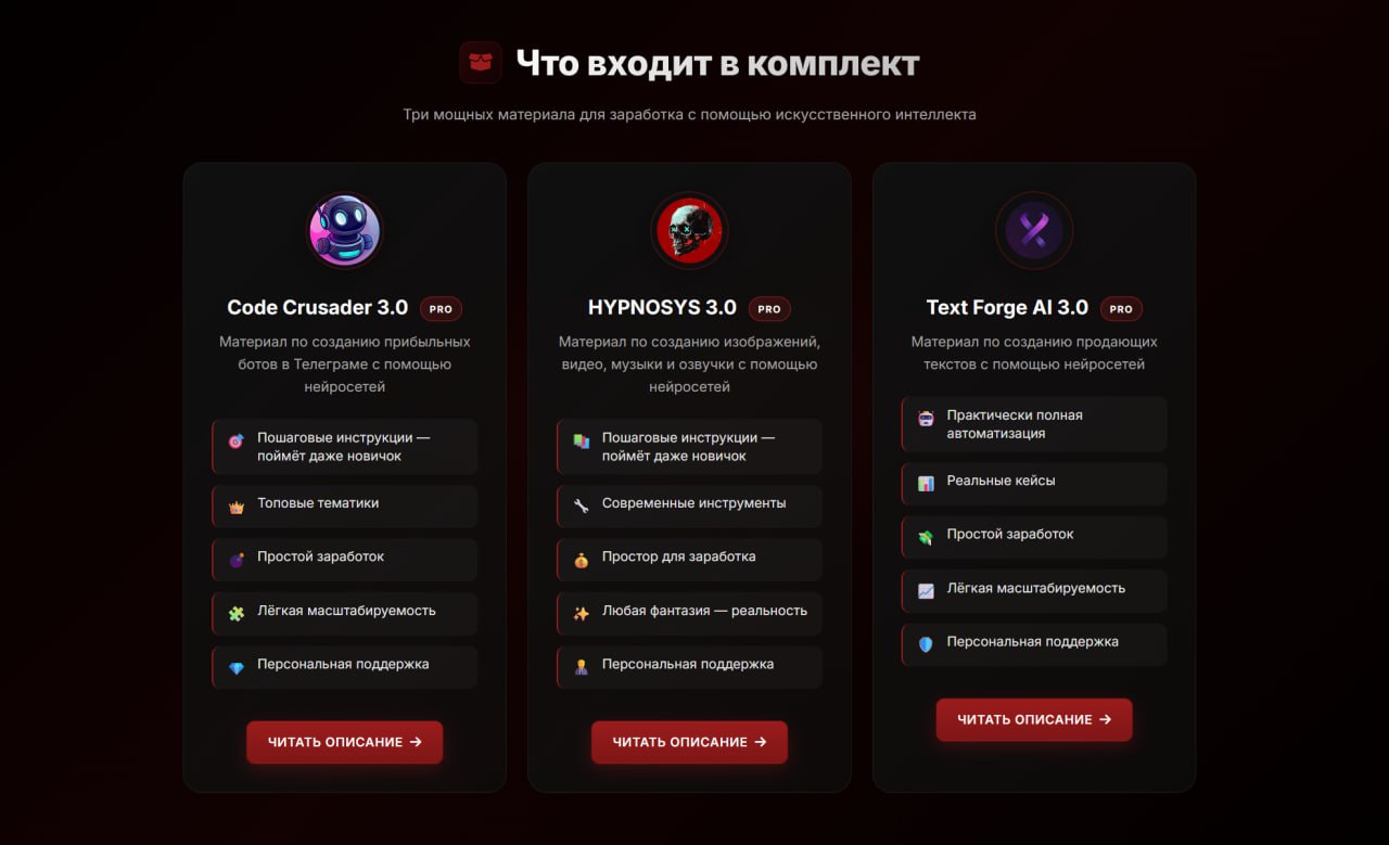 🎁 РАСКРЫВАЮ ВАШИ ПОДАРКИ Сейчас, когда я уже достаточно привлек ваше внимание своим аристократическим размером, можно переходить к деталям — реальному профиту для вас. 🎁 Первый бонус — курс ProLook по профессиональной обработке фотографий через ИИ. Превращайте любые снимки в работы студийного уровня — без фотографов, студий и дорогого оборудования. Результат за ~20 минут. Курс больше купить нельзя (стоил он 1500 рублей), зато можно получить в подарок. 🎁 Второй бонус — доступ на закрытое мероприятие по ИИ. Целых 14 дней вы будете получать по одному полезному навыку ежедневно. Обычно доступ на такое мероприятие начинается от 1500 рублей, но для всех участников новогодней распродажи — даром. А теперь немного о том, какие навыки дадут курсы с распродажи. Приведу примеры на своей деятельности. Вот реальный кейс: знакомому админу нужно было автоматизировать запуск публикаций в 10+ ботах (у него крупная сетка), на что в обычной ситуации уходит ~20 минут: прописать команду /admin → нажать кнопку "рассылка" → закинуть туда пост, который нужно разослать → подтвердить запуск рассылки. На первый взгляд — ничего такого, но попробуйте это сделать с телефона, особенно в движении 🚬 И не с одним ботом, а сразу с 10-15 такими ботами. Вы можете сказать, что ради денег стоит потерпеть. Первое время — да, пока это не станет рутиной. Тогда же на сцену приходит моё решение, которое дало следующие результаты: • Время работы: 2 часа; • Стоимость: 20 000₽; • Бот автоматически проверяет специальные триггеры раз в 5 минут и, когда видит новый контент, выполняет все команды в ботах за админа автоматически. ⚡️В итоге времени на публикацию уходит не 20 минут, а 1 минута. Но мало просто сделать бота функциональным. В мире, где каждое приложение дерётся за внимание, ваш бот должен быть не только полезным, но и визуально привлекательным. 🌚 Поэтому для оформления я использую навыки из курса HYPNOSYS. Создаю уникальные аватары, видео и визуальные компоненты, которые делают ботов (да и все проекты в целом) не просто утилитами, а полноценными цифровыми ассистентами с характером. А для того, чтобы бот действительно продавал услуги, генерировал лиды или квалифицировал клиентов, нужны сильные продающие тексты. И вот тут на помощь приходит Text Forge AI. Почему? Потому что промт-инженерия — это отдельный навык, которому я учу в этом курсе. Недостаточно просто попросить ИИ: "Напиши продающий текст". Нужно знать, как структурировать запрос, какие психологические триггеры использовать и как адаптировать стиль под целевую аудиторию. 🤑Теперь давай посмотрим на цифры: • Средний чек за настройку бота: 15 000–20 000₽; • Среднее время на разработку: 6–12 часов; • Почасовая оплата: ~1700–2500₽/час. Сравни со средней зарплатой по офисным профессиям: 300–400₽/час. Разница в ~6 раз. А всё потому, что 95% людей до сих пор не понимают, как автоматизировать свои рабочие процессы. И готовы платить тем, кто это умеет. 💸 Более того, автоматизация — это масштабируемый бизнес. Создав одного бота, ты можешь: 1. Продавать его копии другим клиентам из той же ниши; 2. Предлагать подписку на обновления и поддержку; 3. Встроить в него дополнительные платные функции; 4. Сделать white label-версию для перепродажи. 🤑 И вот ты уже зарабатываешь не 25 000₽ разово, а 75 000₽, 150 000₽, 300 000₽ — с минимальными дополнительными трудозатратами. Хочешь все нужные навыки