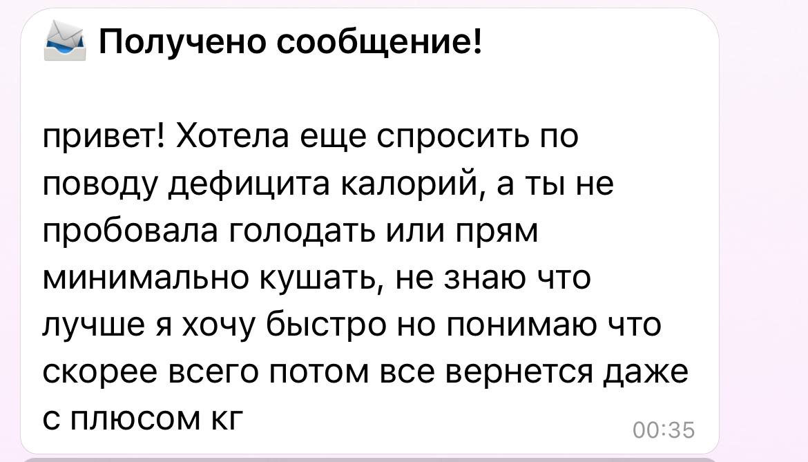 2. я не понимаю, какой смысл такого похудения. ты права, потом этот вес, который ушел прийдет в двойном размере. я вообще не понимаю, как люди голодают, для меня это издевательство над своим огранизмом. я бы на таком «питании» сорвалась давно бы уже и нажрала бы еще +5 кг. вот люди, которые питаются на 1000ккал и тд, они не осознают, что это ненормально, организм в стрессе, начинается выпадение волос и другие побочки, вам это надо? лучше спокойно похудеть на дефиците и резко не снижать его. например, сначала -300ккал, потом через 2-4 недели посмотреть и еще снизить. потому что сразу с 2000 ккал перепрыгнуть на 1300 тяжело, да и зачем вообще. некоторые на голодовке худеют, а некоторые наоборот набирают, я отношусь ко второму типу. из-за того, что организм в стрессе, начинает все жиры запасать. если бы я хотела быстро похудеть, то делала бы по 10-20к шагов, питалась на 1500 и думаю, этого было бы достаточно, для здорового похудения, про бжу не забывать