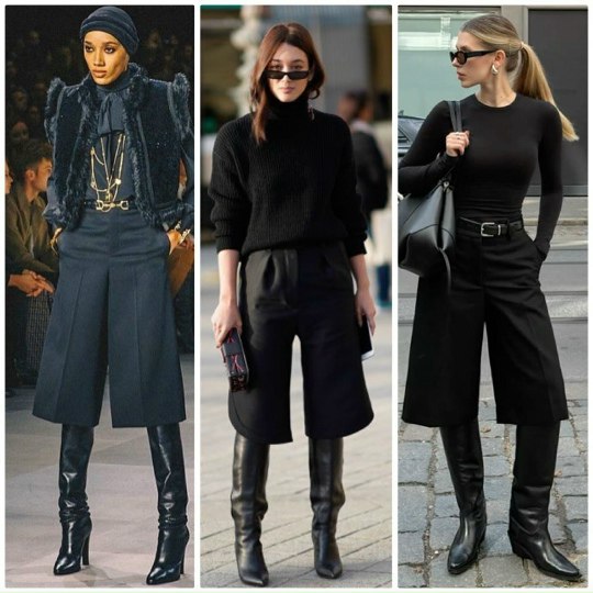 Во-первых, бермуды наиболее выигрышно смотрятся в сочетании с высокими сапогами, при этом важно, чтобы между низом брюк и верхом обуви не оставалось открытого участка кожи — это обеспечивает визуальную целостность силуэта.