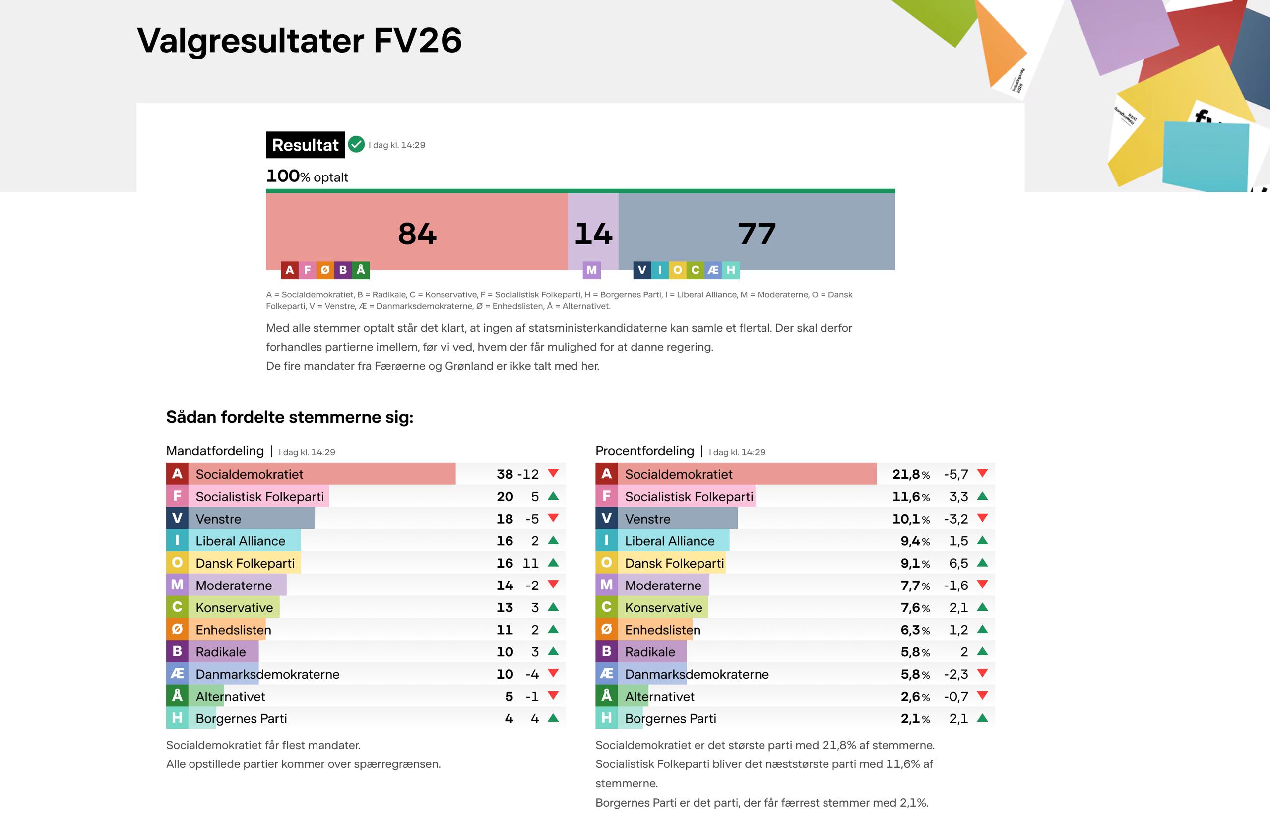 В выборах приняли участие 933 кандидата от 12 партий. По итогам подсчета голосов "датские" места в Фолькетинге распределились следующим образом: