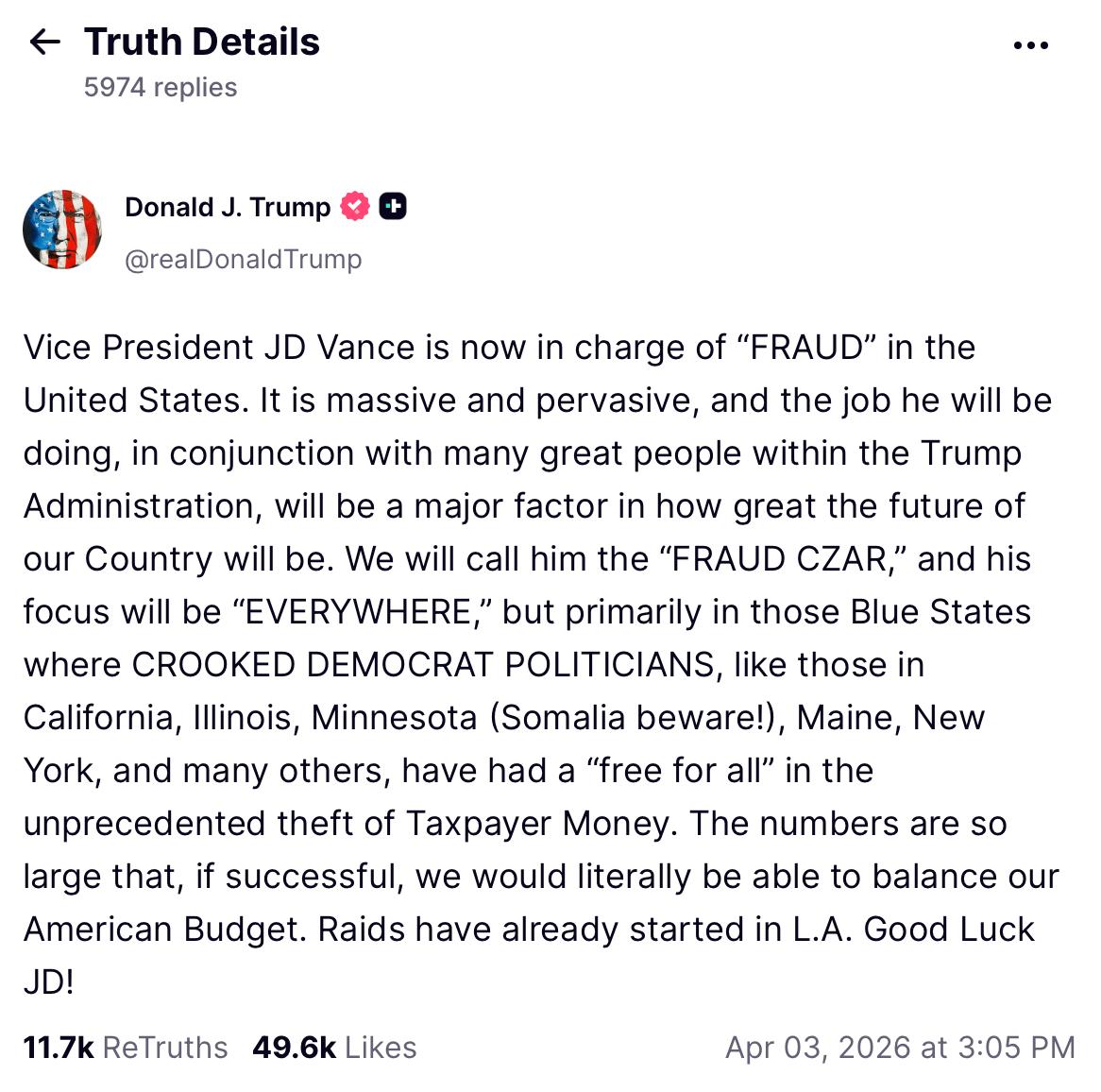Вице-президент Джей Ди Вэнс теперь отвечает за "МОШЕННИЧЕСТВО" в Соединенных Штатах. Оно носит массовый и повсеместный характер, и та работа, которую он будет делать совместно со многими замечательными людьми в администрации Трампа, станет главным фактором того, насколько великим будет будущее нашей страны. Мы будем называть его "ЦАРЕМ ПО БОРЬБЕ С МОШЕННИЧЕСТВОМ", и его внимание будет направлено "ВЕЗДЕ", но прежде всего на те синие штаты, где КОРРУМПИРОВАННЫЕ ПОЛИТИКИ-ДЕМОКРАТЫ, как в Калифорнии, Иллинойсе, Миннесоте (Сомали, берегись!), Мэне, Нью-Йорке и многих других, устроили "беспредел" с беспрецедентным воровством денег налогоплательщиков. Цифры настолько колоссальны, что в случае успеха мы сможем сбалансировать наш американский бюджет. Рейды уже начались в Лос-Анджелесе. Удачи, Джей Ди!