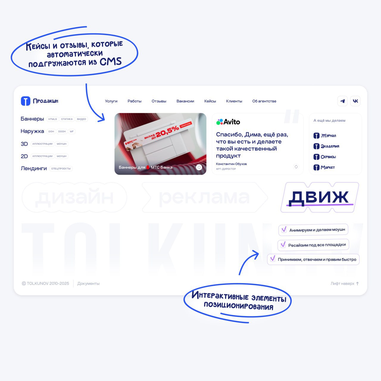 — кейсы и отзывы, которые автоматически подгружаются из CMS