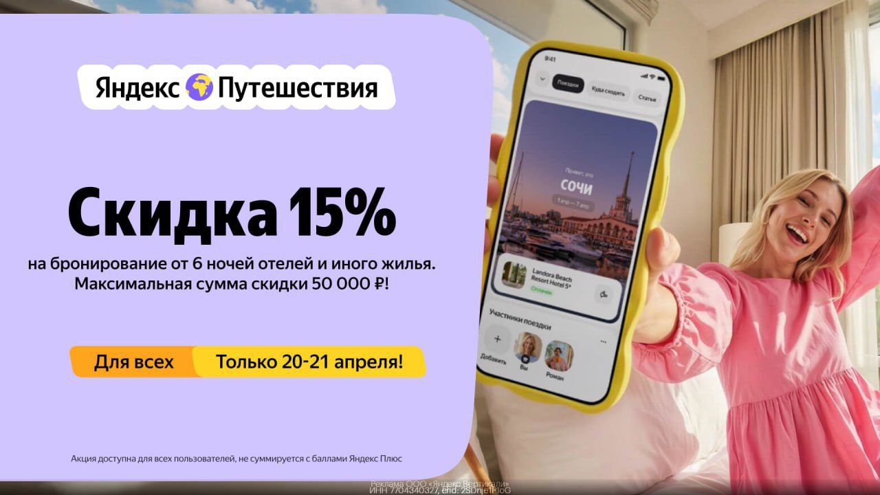 🌍 Яндекс Путешествия — скидка 20% на любое бронирование