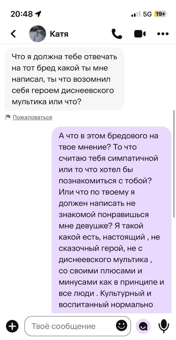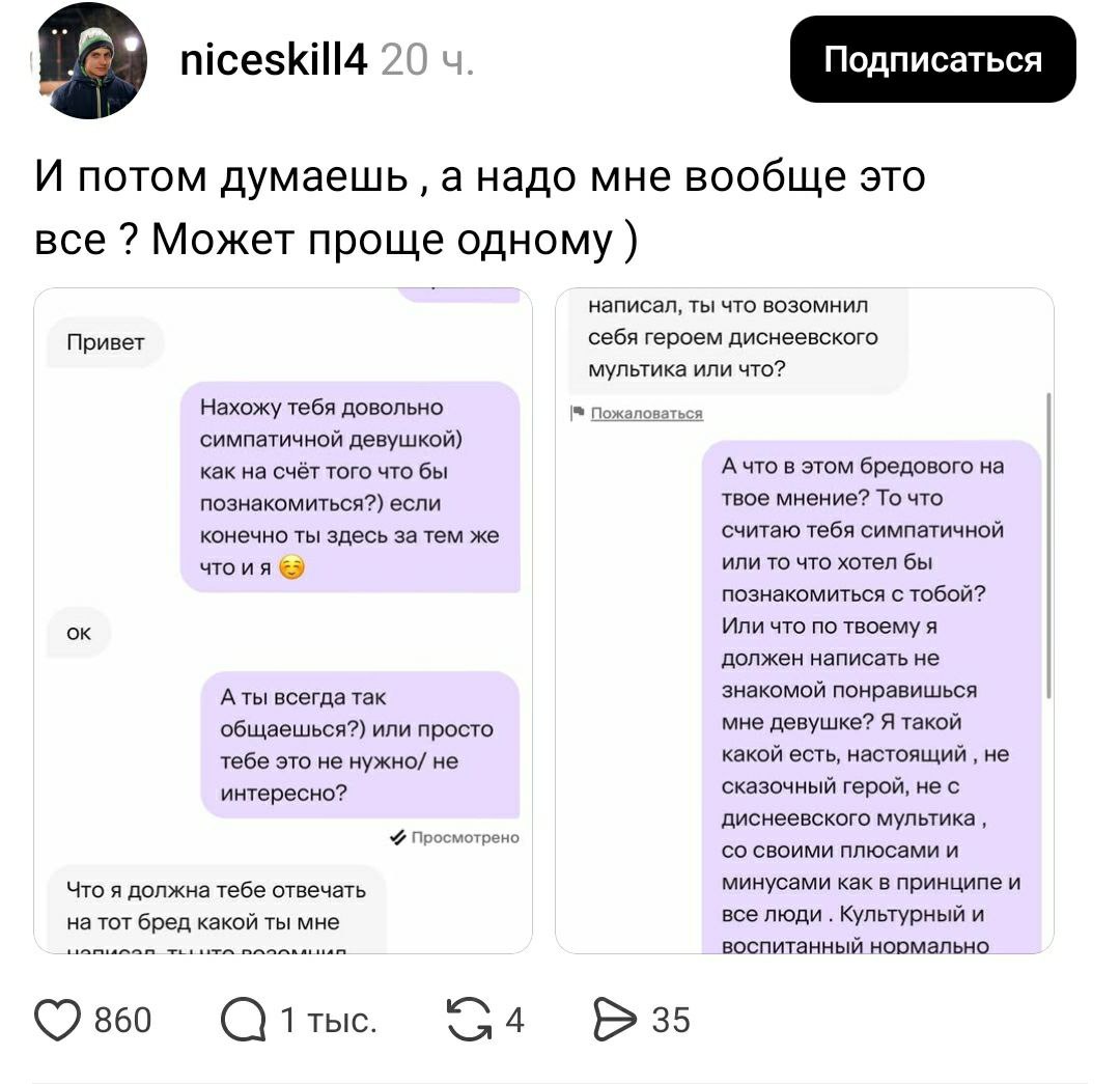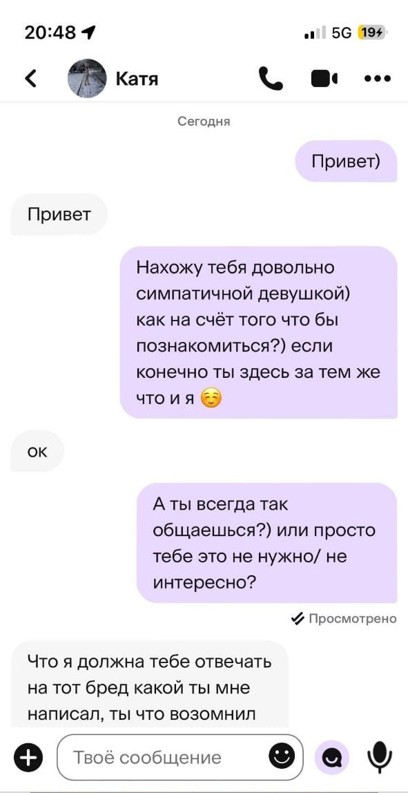 Ну кстати вполне обычная реакция, че еще ответить когда какой-то рандомный мужик пишет. Знакомиться надо ирл в идеале.