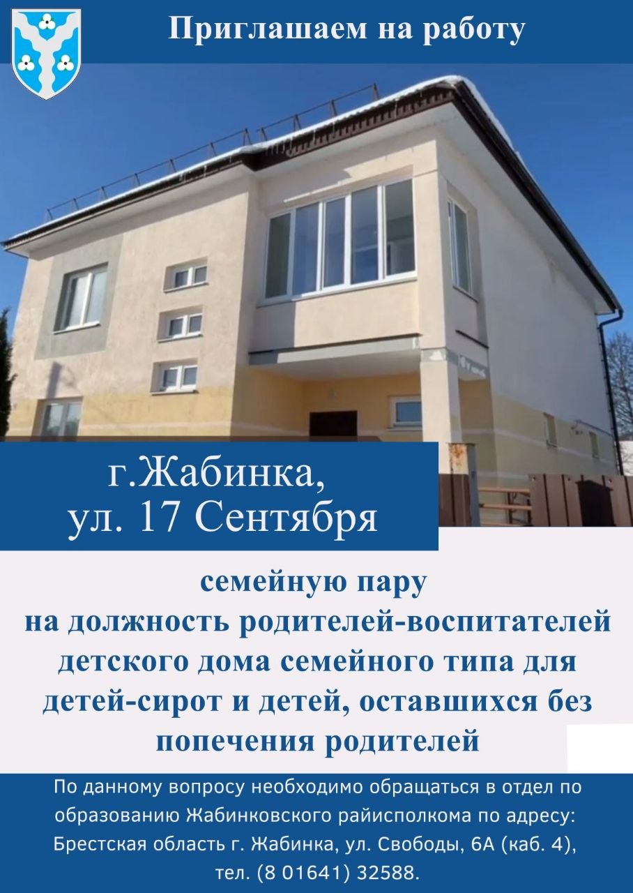 🔵Отдел по образованию Жабинковского районного исполнительного комитета приглашает на работу семейную пару на должность родителей-воспитателей детского дома семейного типа для детей-сирот и детей, оставшихся без попечения родителей, расположенного по ул. 17 Сентября, г.Жабинки.