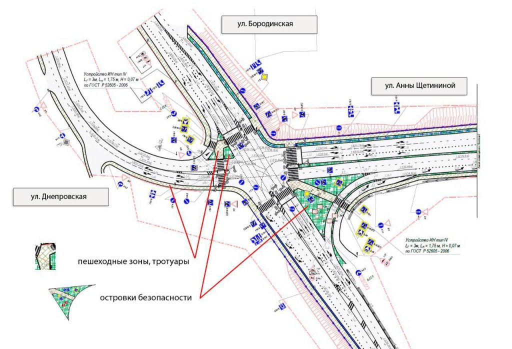 🔹Для безопасности пешеходов появятся тротуары и наземные пешеходные переходы, на пересечении улиц Анны Щетининой, Днепровской и Бородинской - два островка безопасности, через которые будет организовано непрерывное пешеходное пространство.