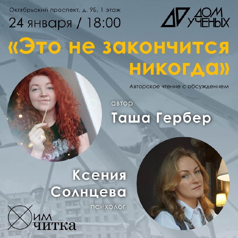 Таша Гербер прочитает отрывки из своего текста, на которые психолог Ксения Солнцева даст профессиональный комментарий.