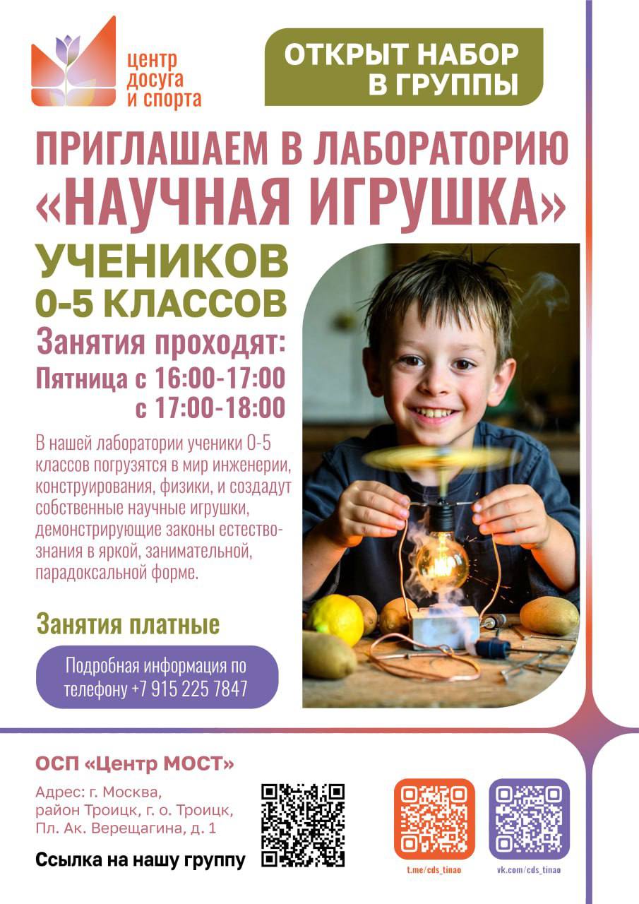 Задайте любые вопросы о программе, расписании и педагоге. Мы с радостью на всё ответим.. Давайте вместе зажжём в вашем ребёнке искру познания, которая станет основой для будущих побед! Задать любые вопросы, узнать расписание можно перейдя по QR коду на афише в ТГ канал группы «Научная игрушка»