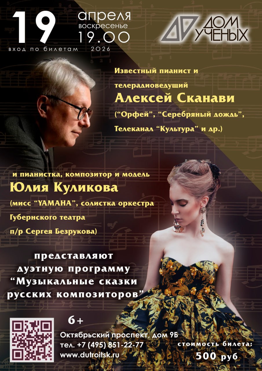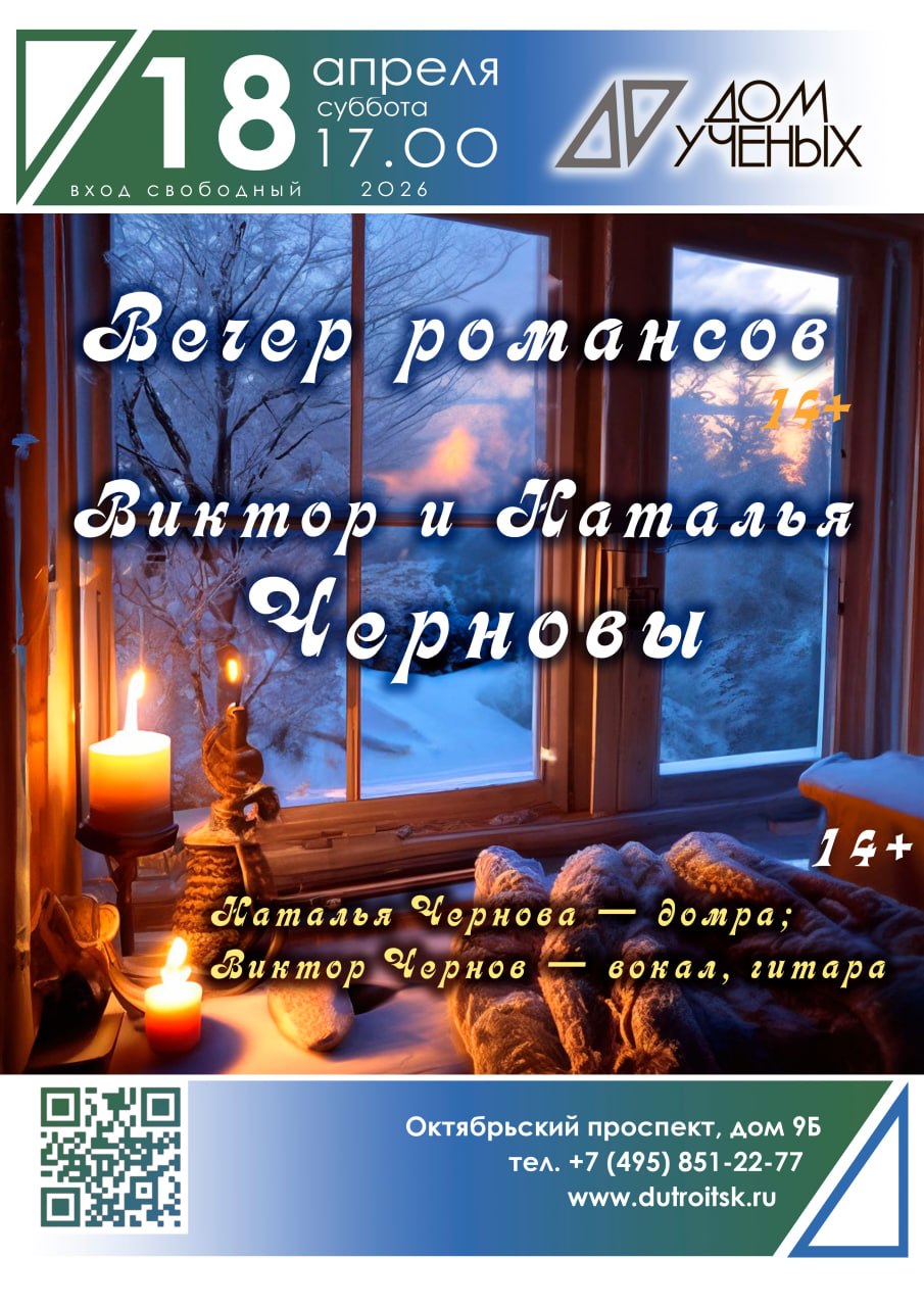 В Троицком Доме учёных РАН — особенный вечер. Наталья и Виктор Черновы собирают маленькую гостиную, чтобы напомнить нам, какими разными могут быть чувства, когда о них поют без фальши. Домра, гитара, голос — и целый XIX век за окном.