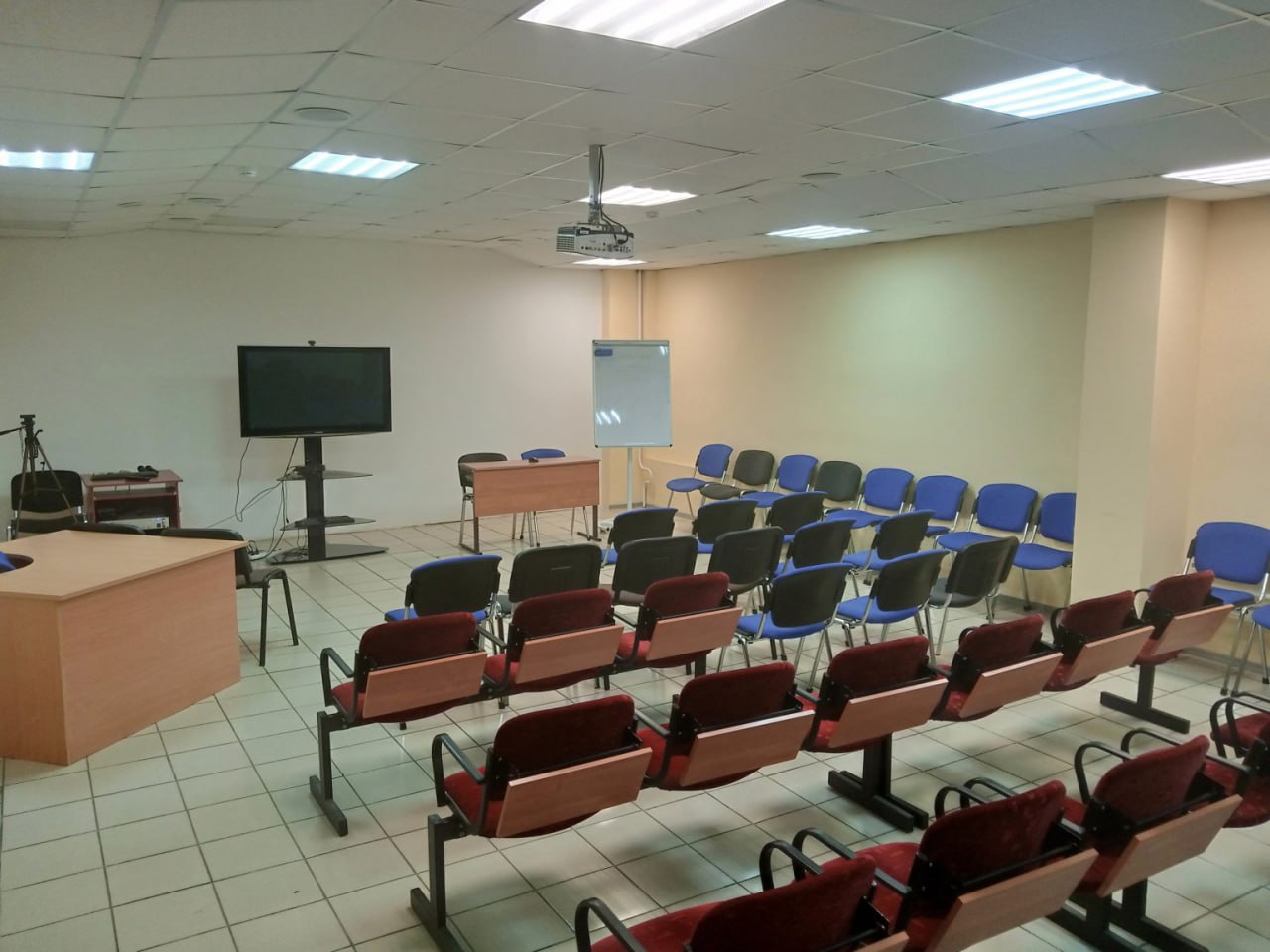 экран, проектор, компьютер, акустическая система, маркерная доска, кондиционер, кулер, гардероб