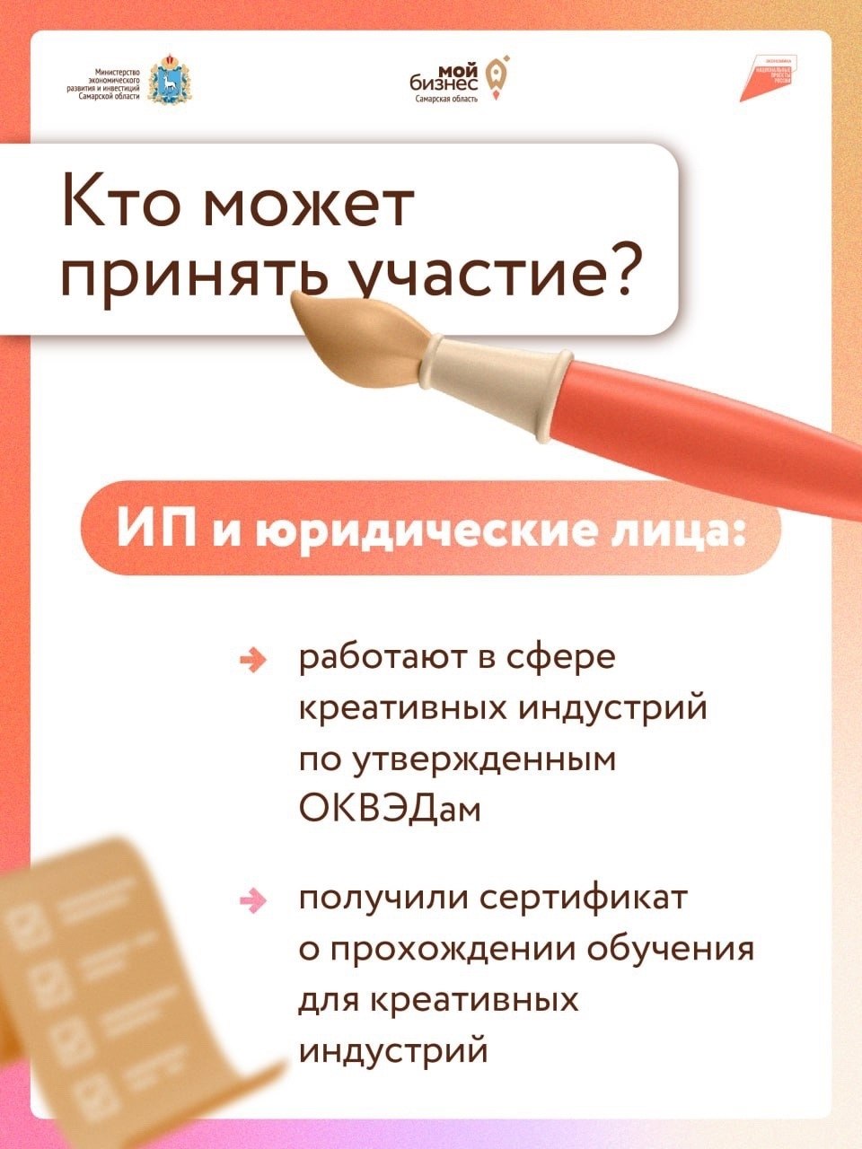- наличие сертификата о прохождении обучения для креативных индустрий