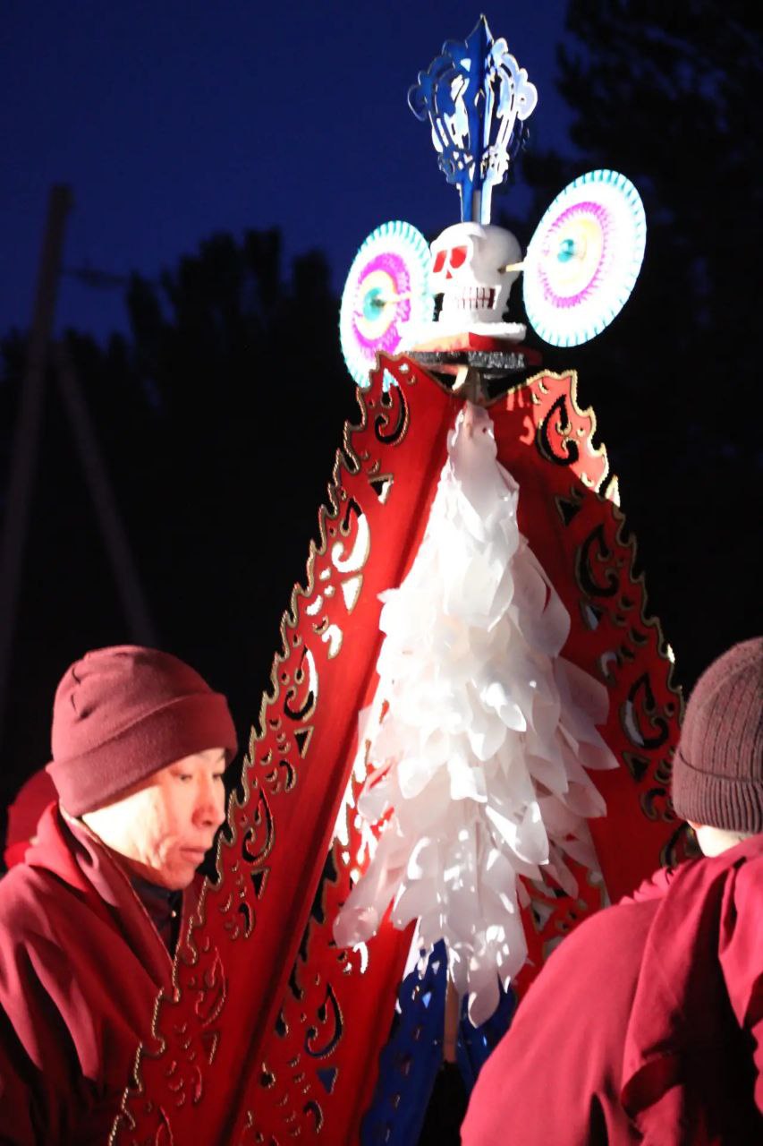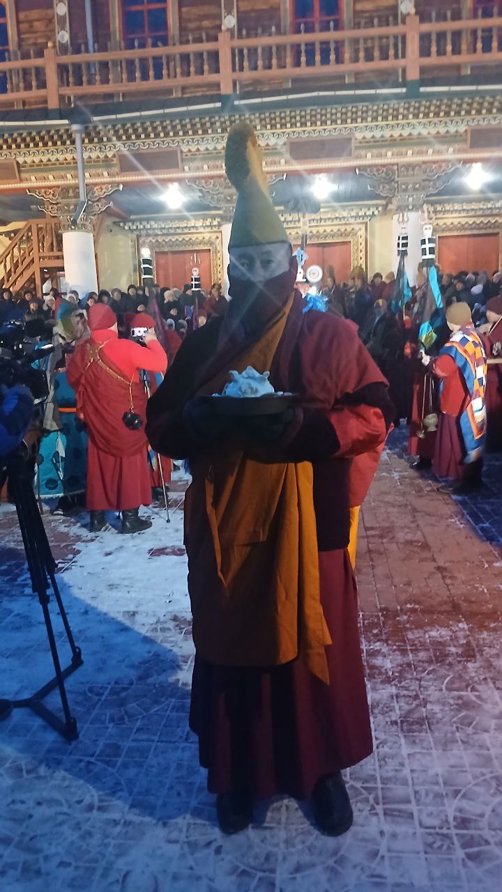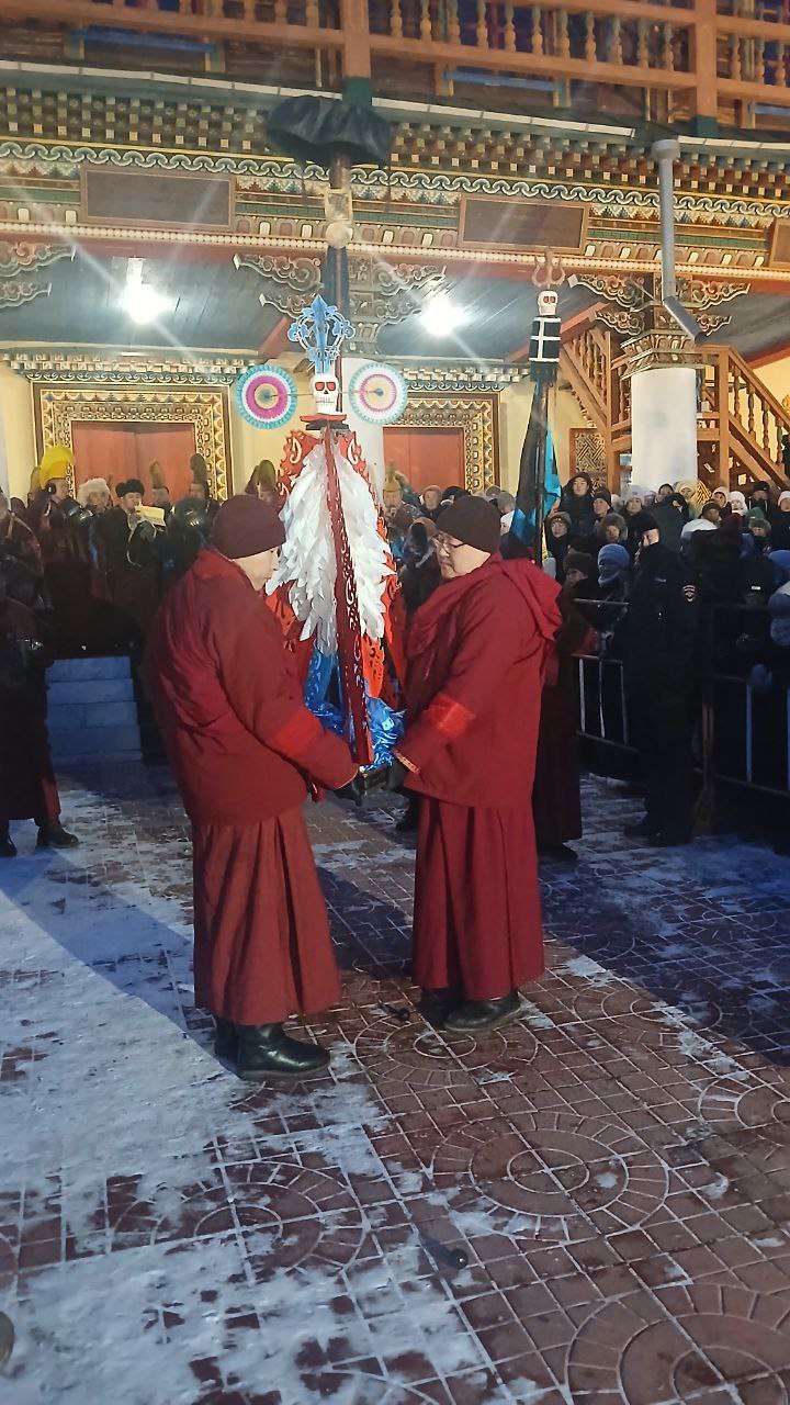 С наступлением сумерек ламы торжественно зажгли пирамиду «соора». Согласно древним традициям, её пламя символизирует уничтожение плохих поступков, злых намерений и всего отрицательного, скопившегося за минувший год.