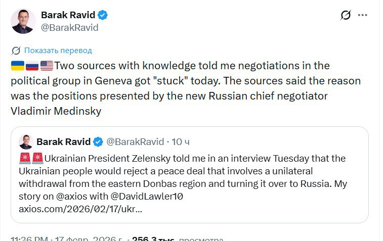 Переговоры по Украине в Женеве зашли в тупик из-за позиции Владимира Мединского, сообщил в X журналист Axios Барак Равид.