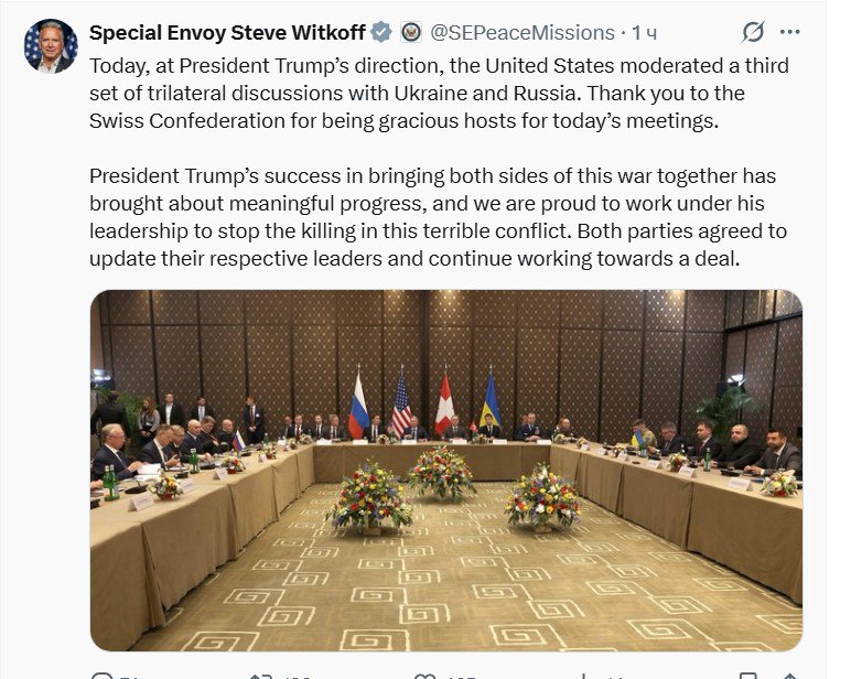 В свою очередь спецпосланник Дональда Трампа Стив Уиткофф заявил о «значительном прогрессе» после первого дня переговоров в Женеве.