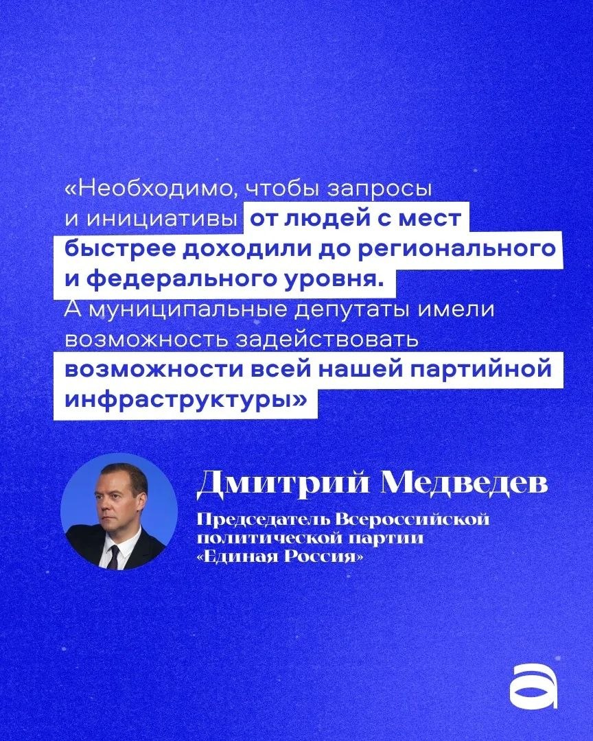 Председатель партии «Единая Россия» Дмитрий Медведев, выступая на Всероссийском форуме «Малая Родина — Сила России», поручил создать правовую основу для защиты муниципальных служащих и отметил, что мощный кадровый ресурс — это Ветераны СВО. В своих городах и сёлах им доверяют, видят в них настоящий авторитет. Своих защитников. Именно они должны быть привлечены в работу местного самоуправления.