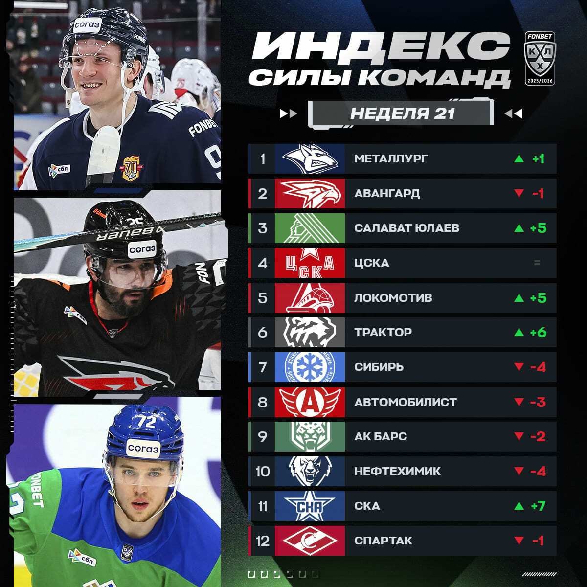 🧐 "Ак Барс" тем временем потерял две позиции индекса силы команд по итогам 21 недели регулярного сезона КХЛ. Пока - на 9 строчке, в компании "Автомобилиста" и "Нефтехимика"