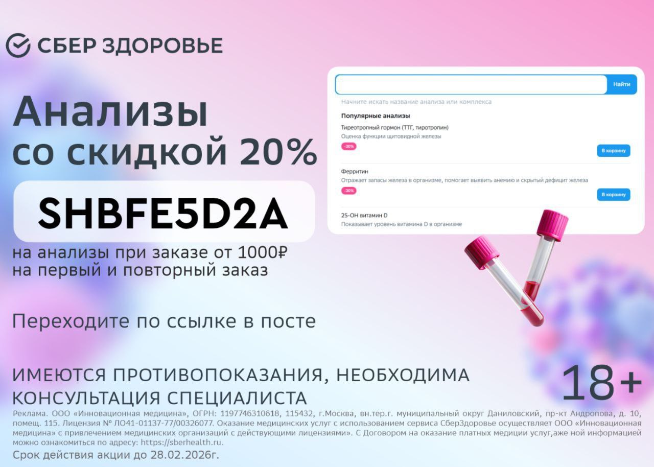 ➡️ Перед оплатой примени промокод SHBFE5D2A - на любые анализы от 1000₽