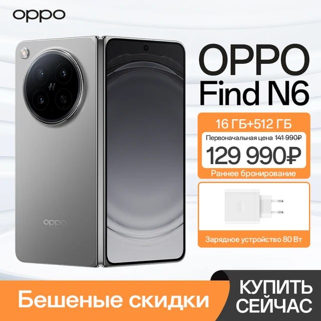 Складной смартфон Oppo Find N6 глобальная версия 16/512 ГБ. Компактный дизайн с большим внутренним экраном для работы и кино. Мощный процессор для игр и многозадачности. Камера 50 МП с оптической стабилизацией. Емкий аккумулятор с быстрой зарядкой. Поддержка 5G и NFC.