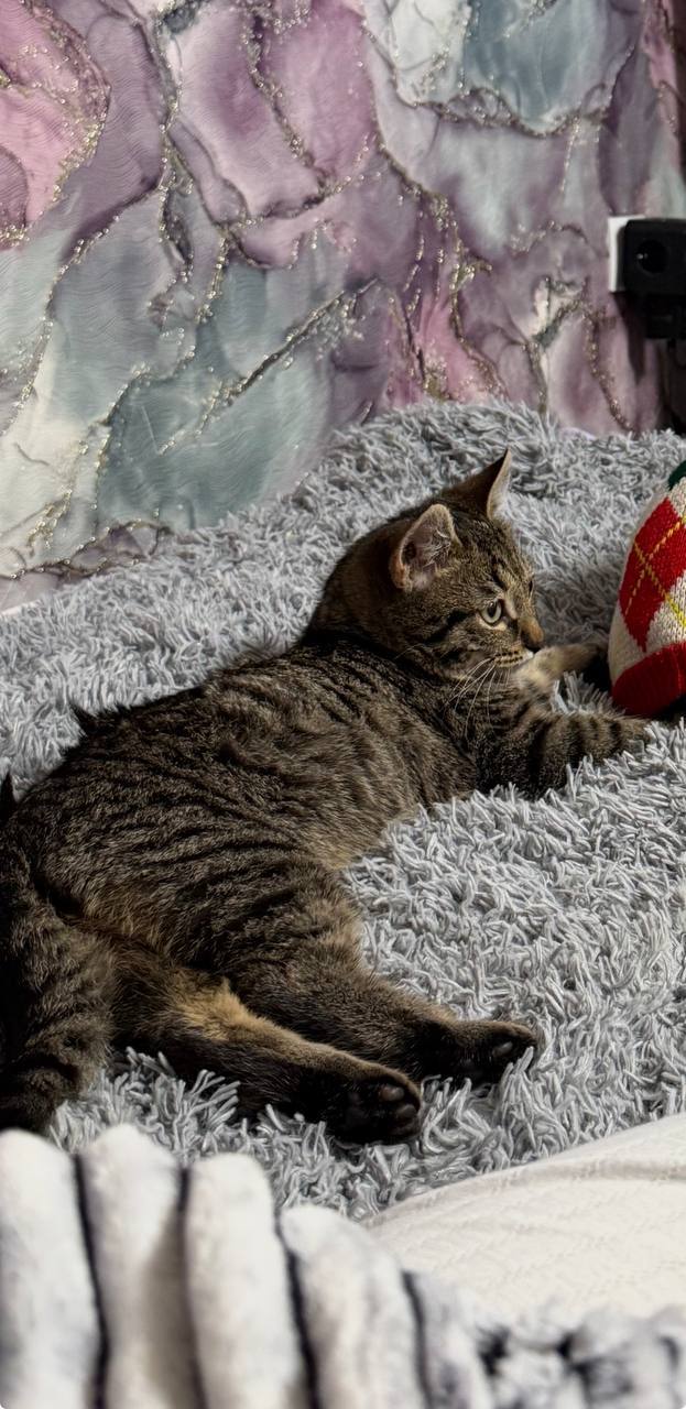 Описание: маленький домашний котёнок, серо-коричневый полосатый окрас,