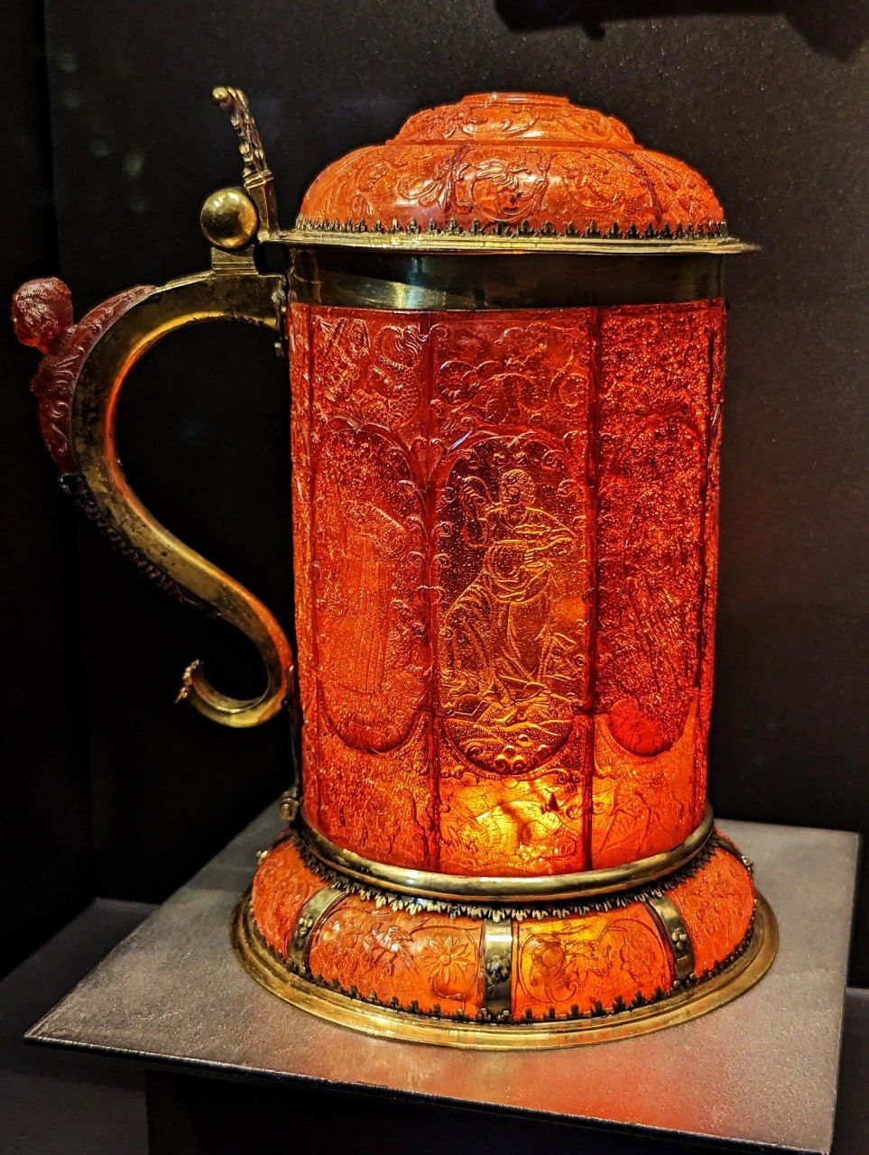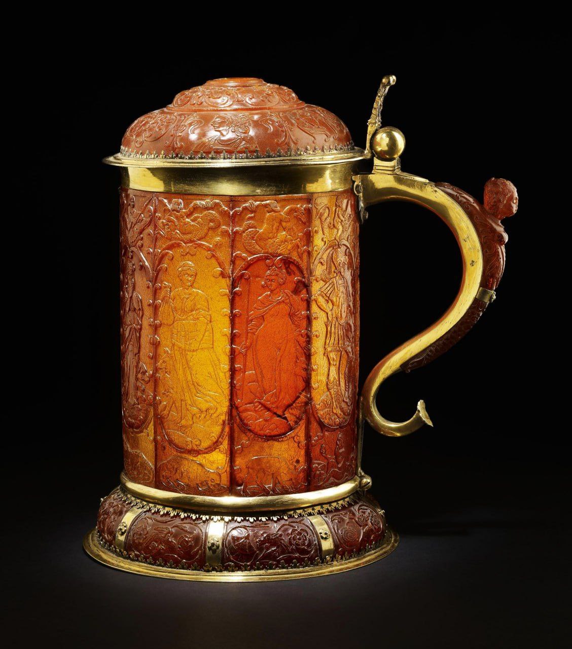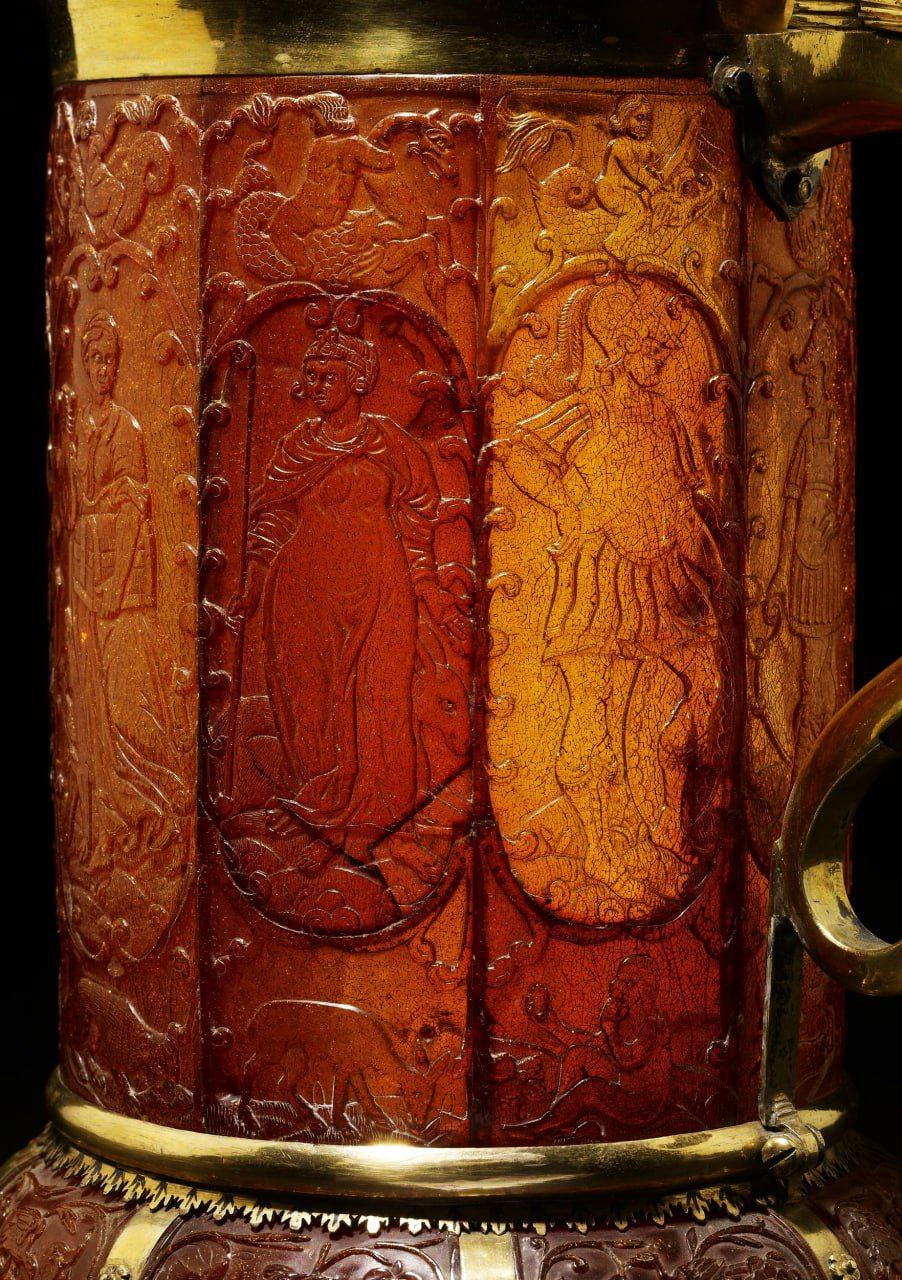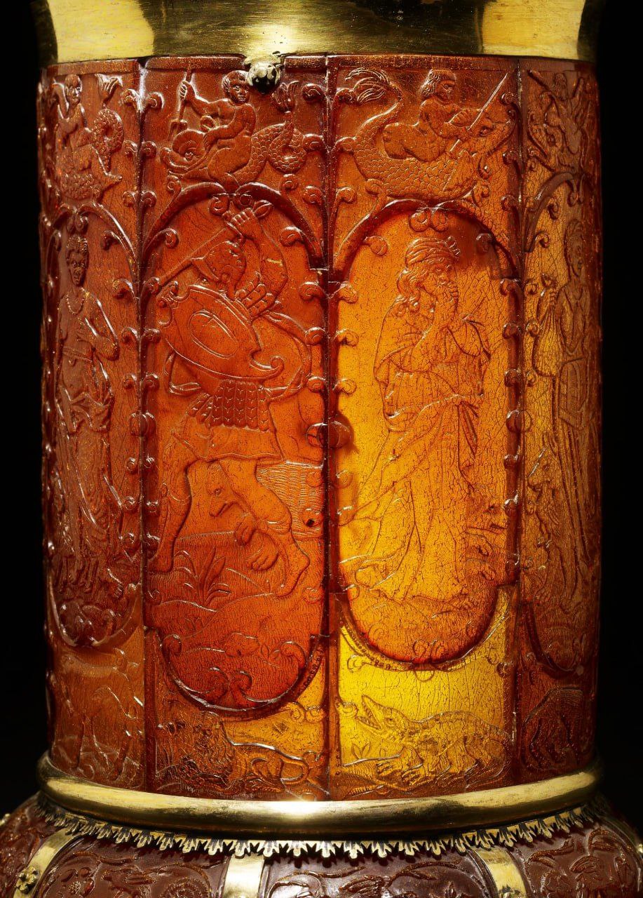 Королевская пивная кружка XVII века из янтаря, позолоченного серебра и слоновой кости, с изображением 7 смертных грехов, Швеция, ок. 1640-1660 гг.