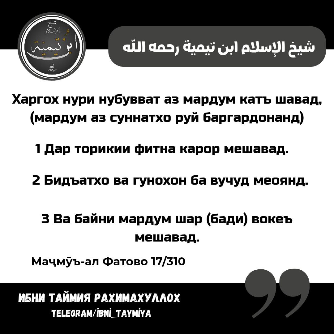 Шайхул Ислом ибни Таймия 🇧🇬 мегӯяд: Ҳаргоҳ нури нубувват аз мардум қатъ шавад, (мардум аз суннатҳо руй баргардонанд) 1 Дар торикии фитна қарор мегиранд. 2 Бидъатҳо ва гуноҳон ба вуҷуд меоянд. 3 Ва байни мардум шар (бадӣ) воқеъ мешавад". Маҷмӯъ-ал Фатово 17/310