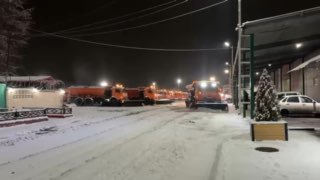 🚚 В час ночи спецтехника приступила к сгребанию снежной каши с дорожного полотна. Машины двигались организованными колоннами: такая расстановка необходима, чтобы за один проход полностью очистить проезжую часть по всей её ширине, сдвигая снег от центра к обочинам.