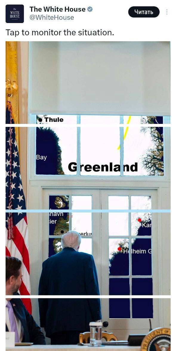 В это же время Трамп постит картинку, как он смотрит в окно на Гренландию.😘