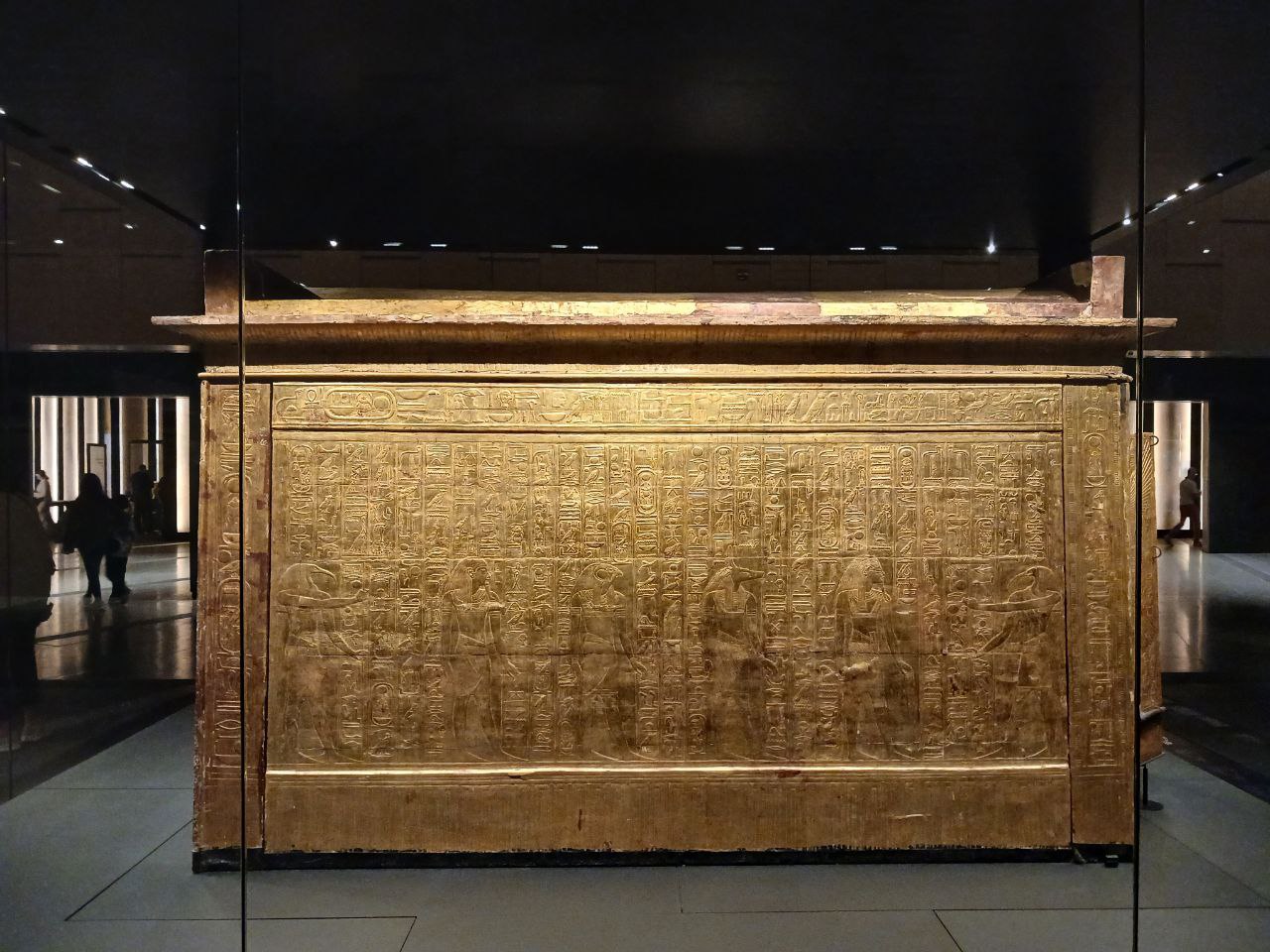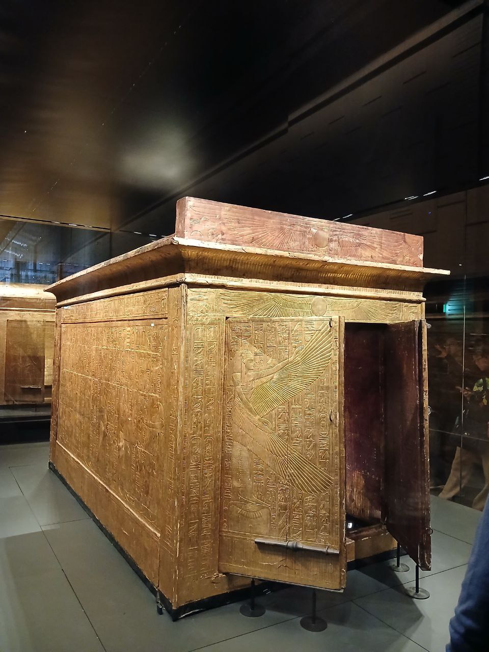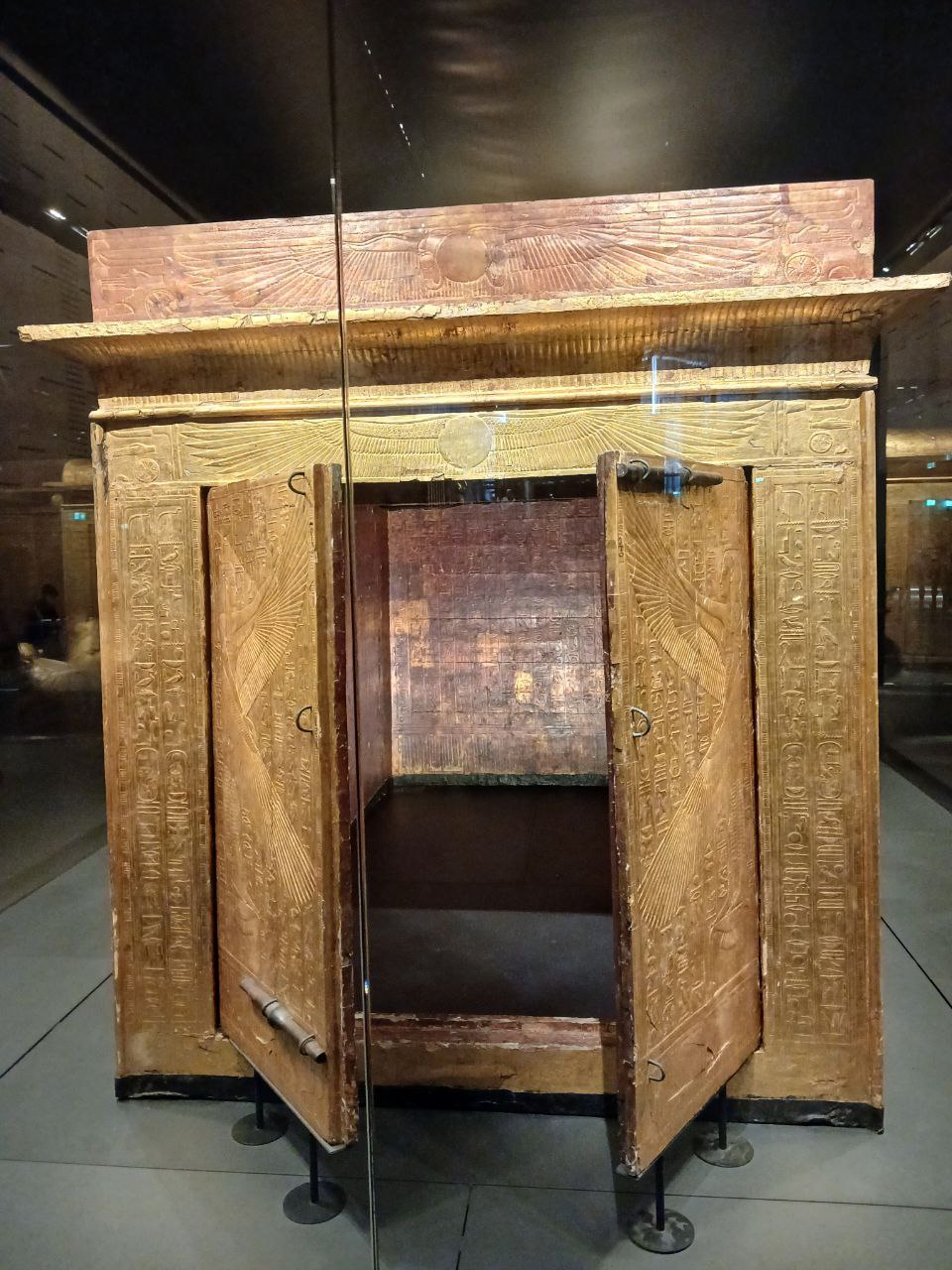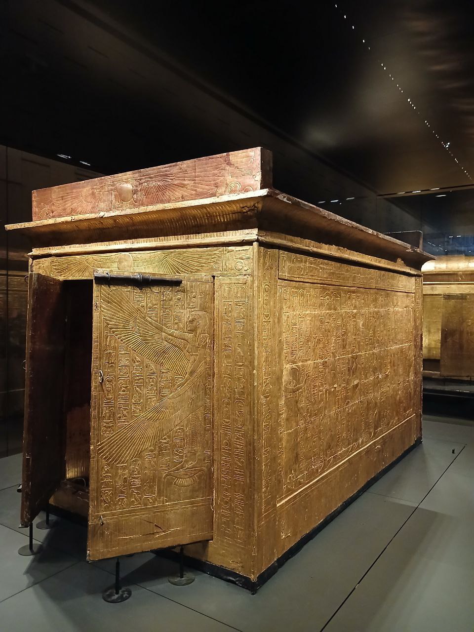 The left and right side panels carry scenes of procession of Imsety, Anubis, Duamutef and Geb, and of Hapy, Anubis, Qebhsenuef and Horus between figures of Thot supporting the sky. The back and the outside door panels carry protective images of the winged Isis and Nephthys. The ceiling of is decorated with a of the goddess Nut stretching her wings, flanked by the falcon headed Horus.