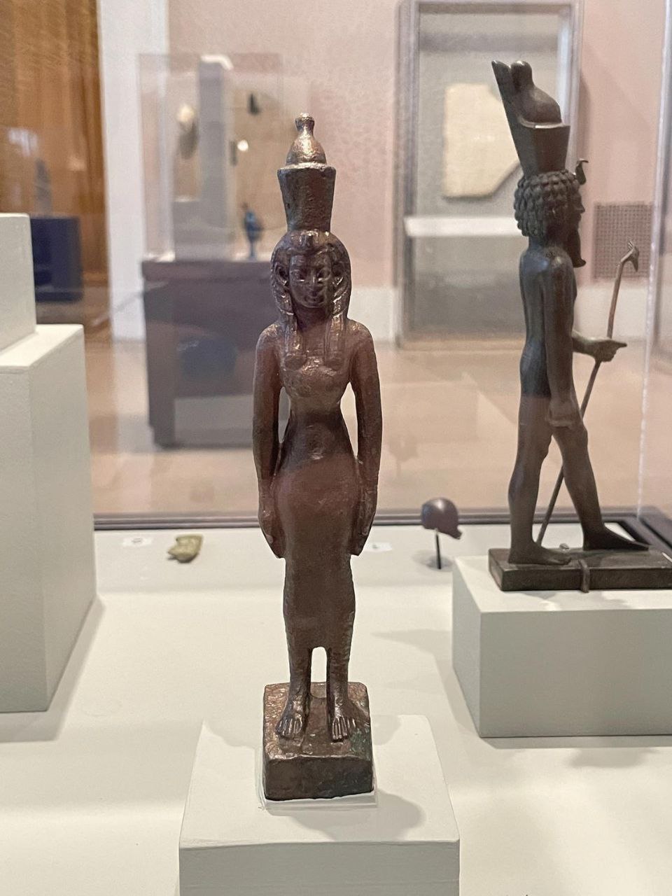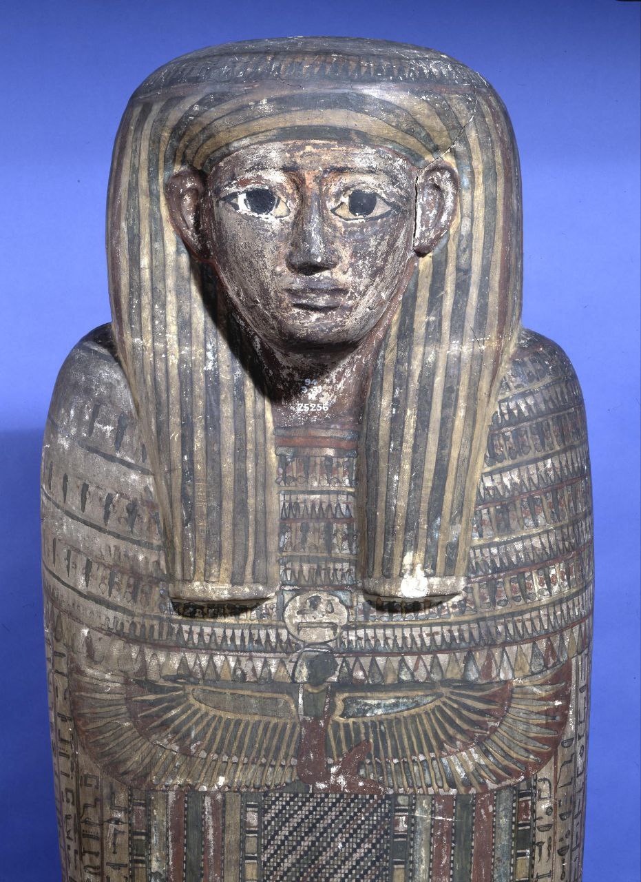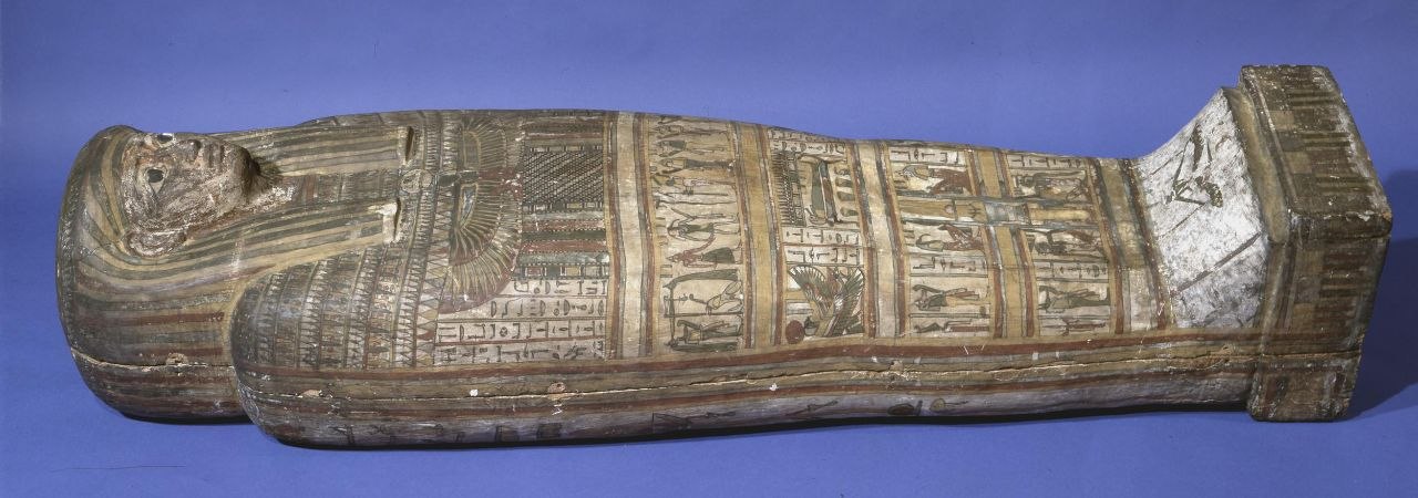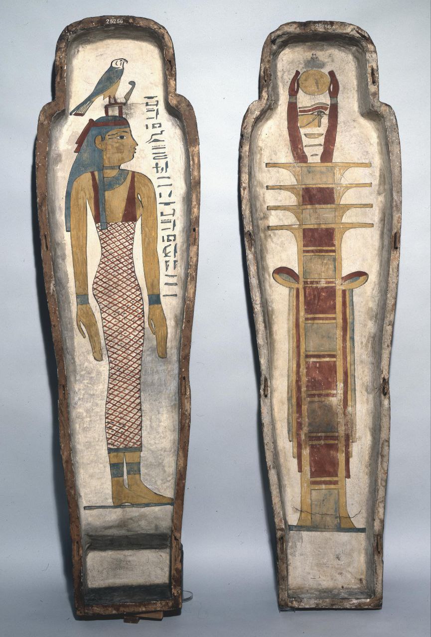 The left and right side panels carry scenes of procession of Imsety, Anubis, Duamutef and Geb, and of Hapy, Anubis, Qebhsenuef and Horus between figures of Thot supporting the sky. The back and the outside door panels carry protective images of the winged Isis and Nephthys. The ceiling of is decorated with a of the goddess Nut stretching her wings, flanked by the falcon headed Horus.