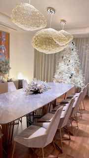 В оформлении дома я попыталась воплотить настоящую сказку: огромные еловые лапы, будто припорошённые снегом, золотистые шары, серебряные коньки, миниатюрные пушистые варежки, шишки и сверкающие сосульки – у нас будто зимний лес! А ещё я спрятала среди украшений три волшебных желудя, в которых мои самые главные желания на 2026 год, а охраняют их лесные птицы и хрустальные медвежата — пусть они берегут мои мечты в новом году. 🐦✨