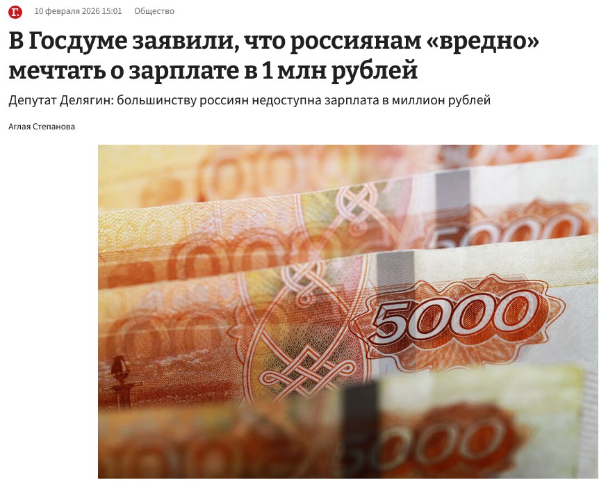 Недавно в комитете по экономической политике выдали мысль: мол, мечты о миллионе «контрпродуктивны». Это якобы для единиц, для «образованных и востребованных». А всем остальным лучше смотреть на реальность, где у многих доходы всё ещё 40 тысяч и ниже.