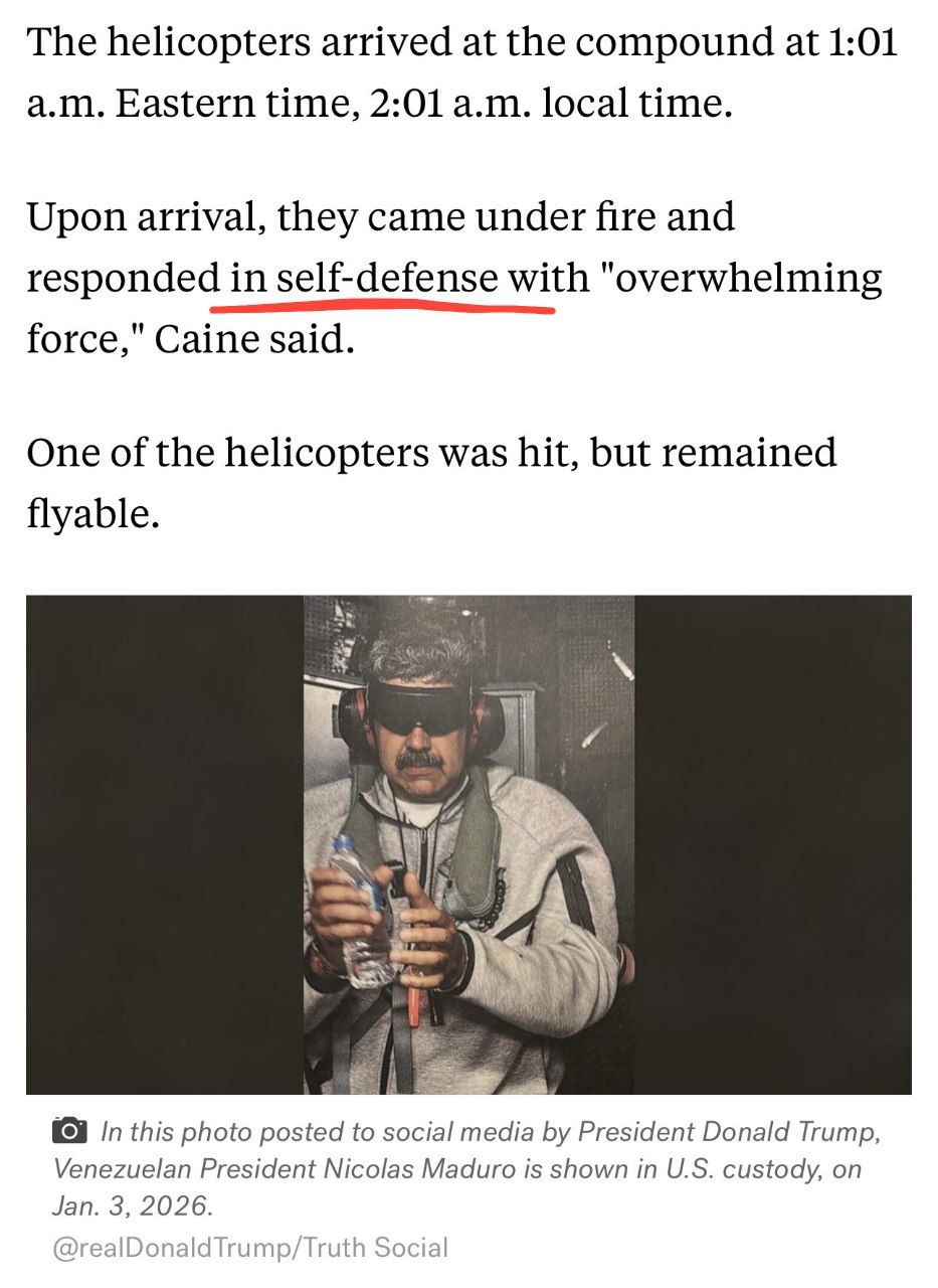 По этой версии Мадуро договорился о тайных переговорах с Марко Рубио, который должен был прилететь в Каракас на вертолётах с охраной. И, разумеется, вертолёты эти должны были пропустить все венесуэльские военные. Но по прибытии оказалось, что вместо Рубио к Мадуро прилетели головозрезы из Дельты. Другими словами, президента Венесуэлы жёстко и подло обманули.