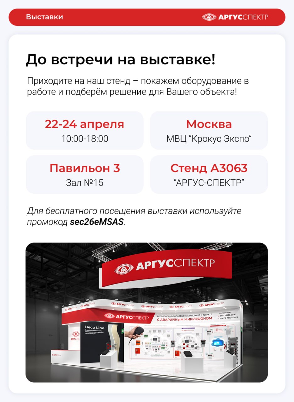 Продолжить знакомство с решениями "АРГУС-СПЕКТР" и увидеть их вживую можно на выставке Securika Moscow 2026: