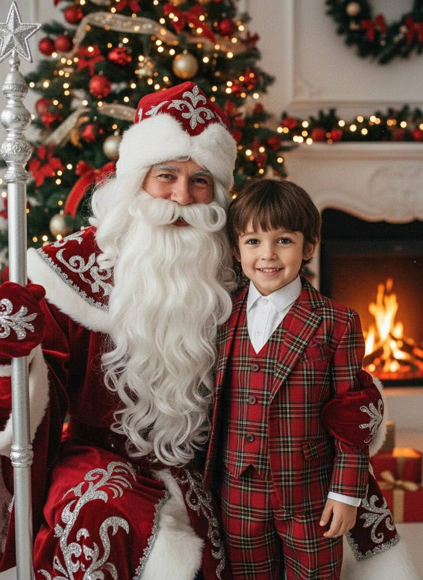 На стене висит классический красный шерстяной ковер с детальным восточным орнаментом. Рядом стоит высокая винтажная лампа с бежевым абажуром и бахромой, дающая теплый, мягкий свет. Слева стоит небольшая искусственная елка, украшенная разноцветными шарами и дождиком.