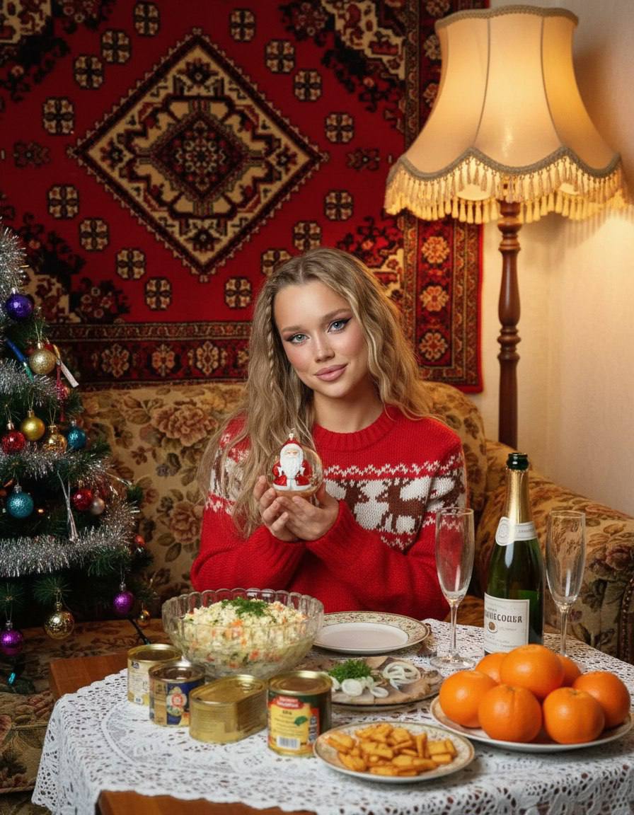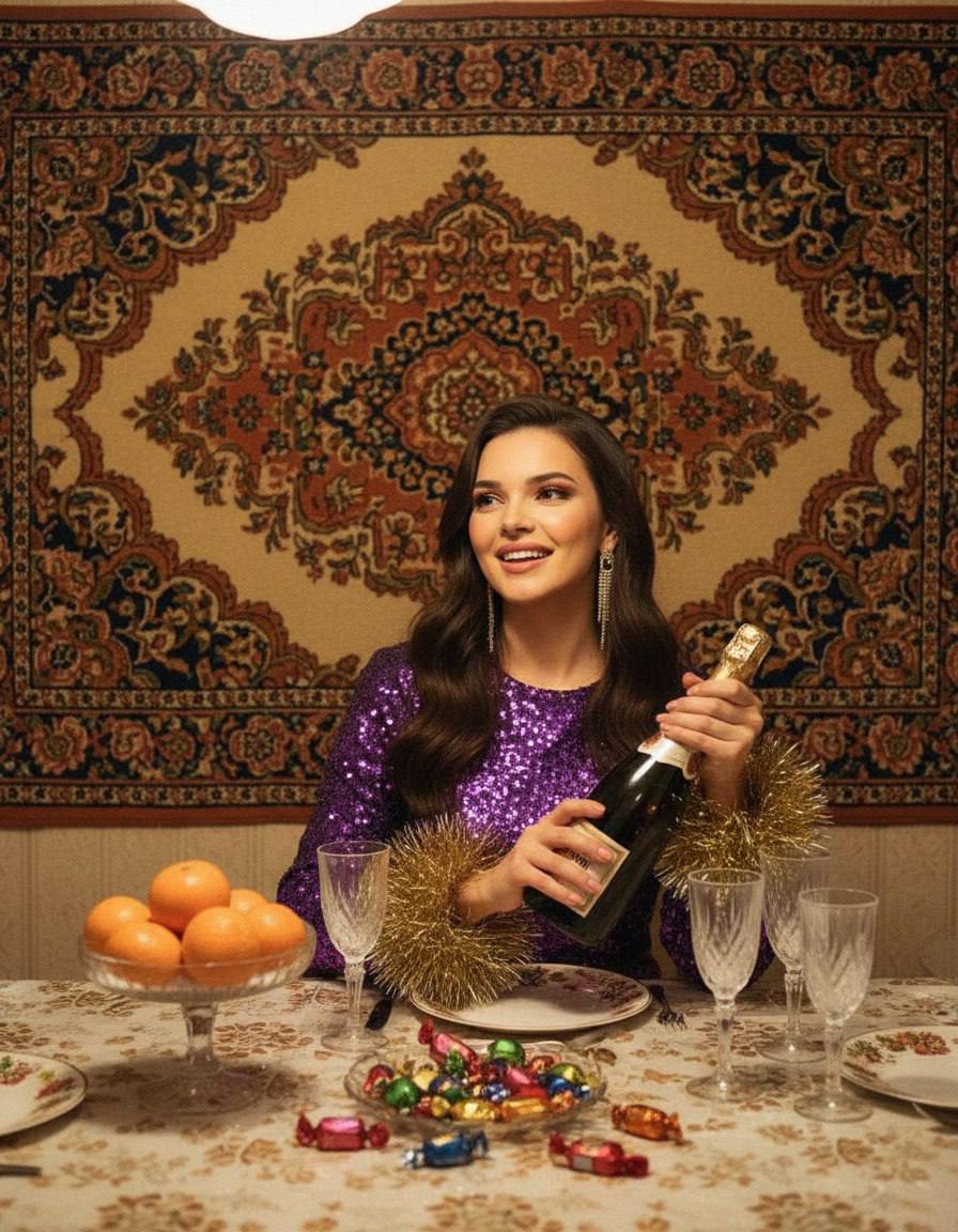 Праздничный стол: Перед женщиной накрыт стол с белой скатертью. На столе стоят традиционные блюда: салат «Оливье» в хрустальной вазе, тарелки с мандаринами, нарезка сельди, шпроты, закуски и бутылка советского шампанского с тонкими фужерами.