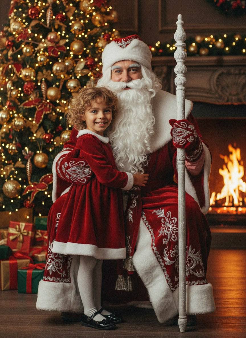 Создай крупный портрет, не меняя черты лица. Реалистичное фото женщины в уютной домашней обстановке, празднующего Новый год в стиле СНГ 90-х или начала 2000-х.Она одета в теплый красный вязаный свитер с оленями. Она сидит на винтажном диване и в руках елочный шар с изображением Деда Мороза».смотрит в камеру. Ее волосы кудрявые длинные . Профессиональный макияж.