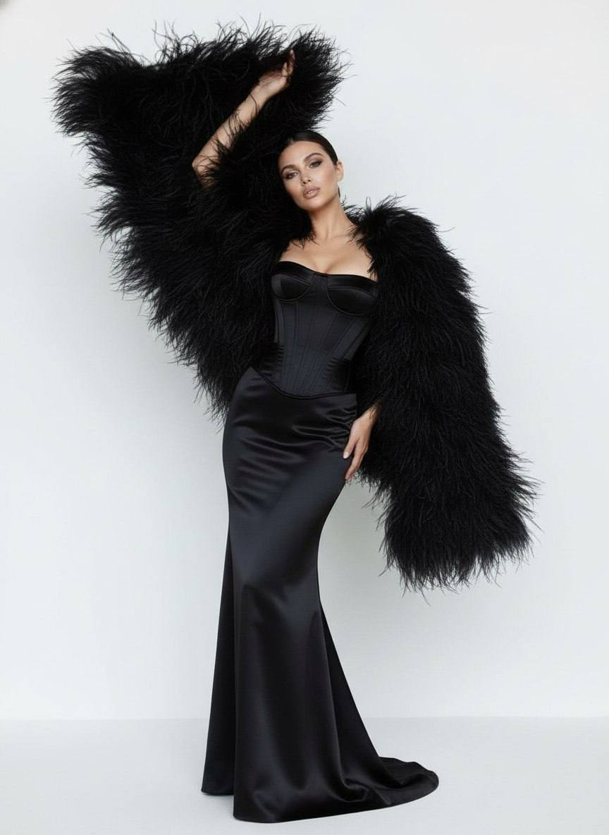 She is wearing a floor-length, fully lined, form-fitting black satin corset gown made of luxurious high-gloss black satin fabric with a rich, smooth sheen and a refined opaque finish. The dress features a structured corset bodice with defined boning, a cinched waist, elegant vertical seams, and a sophisticated neckline appropriate for luxury runway and editorial fashion photography.