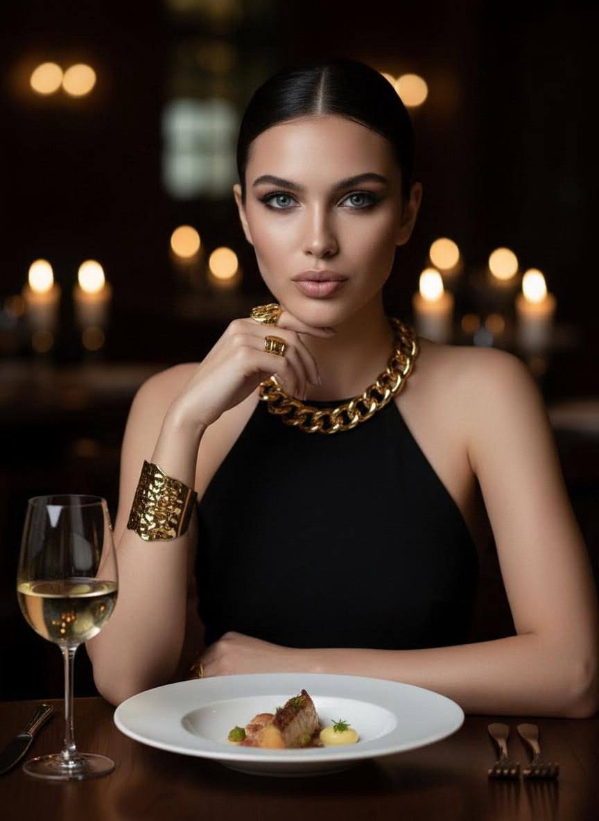 Luxury fashion photography aesthetic, clean composition, polished, realistic, sophisticated, non-erotic, magazine-quality.