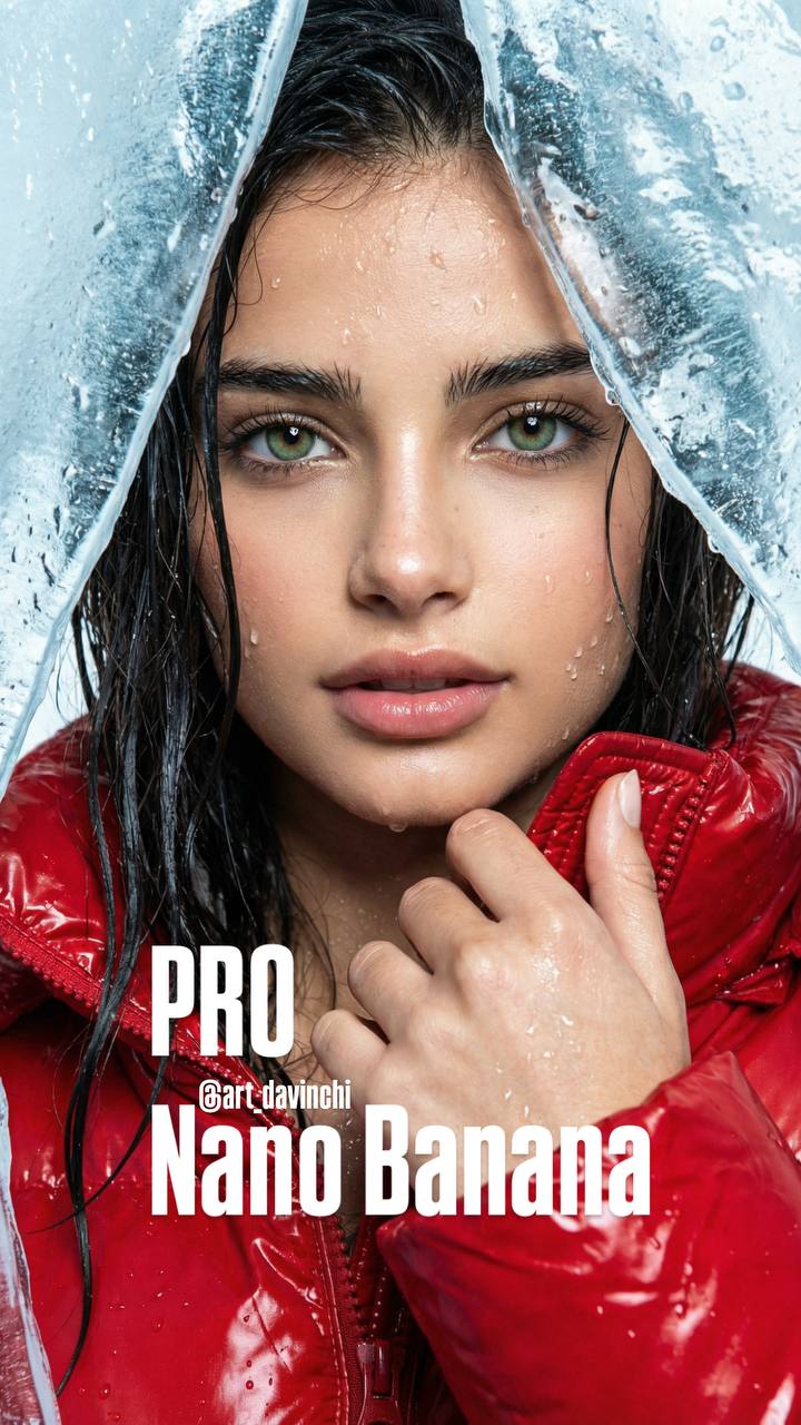 broken ice sheet, studio setting with ice element, ice, human skin, wet hair, glossy fabric (jacket), woman with fair skin, prominent cheekbones, full glossy nude lips, bright green eyes, dark defined eyebrows, long dark wet hair with water droplets, water droplets on skin, glossy lips, detailed makeup, water droplets on skin and hair, wet skin texture, retouching, cinematic color grading, highlight enhancement