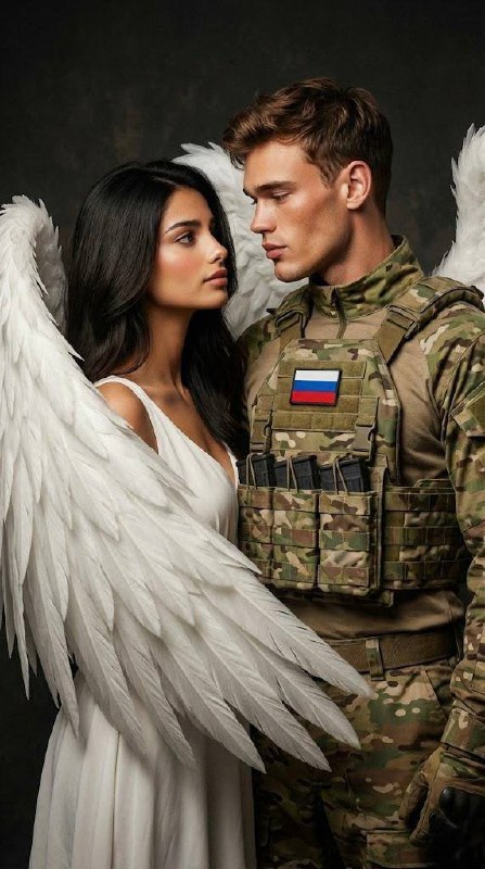 Создайте портрет в формате, не меняя черты лица, в точности как на референсах. Схожесть 100% крупный план с высокой детализацией портрета той же женщины с оригинальной фотографии, сохранив ее естественное лицо в точности неизменным. Не изменяйте никаких черт лица, пропорций, текстуры кожи или цвета глаз. На ней белое платье, сзади неё большие ангельские крылья. Рядом с ней стоит мужчина в военной форме России и бронежилете (все это цвета мультикам), она смотрит на мужчину, он смотрит на неё. Она будто закрывает его крыльями обнимая. Крылья обнимают мужчину со спины, будто закрывают его от чего-то