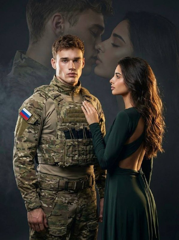 Строго сохрани черты лица мужчины и женщины с референс фото. Кинематографичный вертикальный студийный портрет с элементами двойной экспозиции. --ar 3:4. Передний план: мужчина в полный рост в тактической военной форме расцветки "мультикам", в бронежилете, на рукаве отчетливо виден шеврон с флагом России. Он стоит прямо, руки опущены, взгляд в камеру спокойный, уверенный и стоический. Рядом вплотную к нему стоит женщина в профиль, нежно положив руку ему на плечо. На ней элегантное темно-зеленое облегающее платье с открытой спиной. Длинные волнистые волосы сияют в лучах света. Безупречный естественный макияж, взгляд с любовью направлен на мужчину. Задний план: глубокий темно-серый фон с легкой дымкой, на котором размещено полупрозрачное, эфирное наложение — крупный план их нежного поцелуя с закрытыми глазами, стилизованное под воспоминание. Освещение: драматичный студийный свет, сильный контровой свет (rim light), создающий золотистый ореол вокруг силуэтов. Цветовая гамма: сдержанные тона хаки, оливы и графита, где кожа и волосы женщины являются самыми светлыми акцентами. Высочайшая детализация текстур ткани, кожи и волос, фотореализм, 8k. Сохраняй черты лица и идентичность персонажа с прикрепленного референса