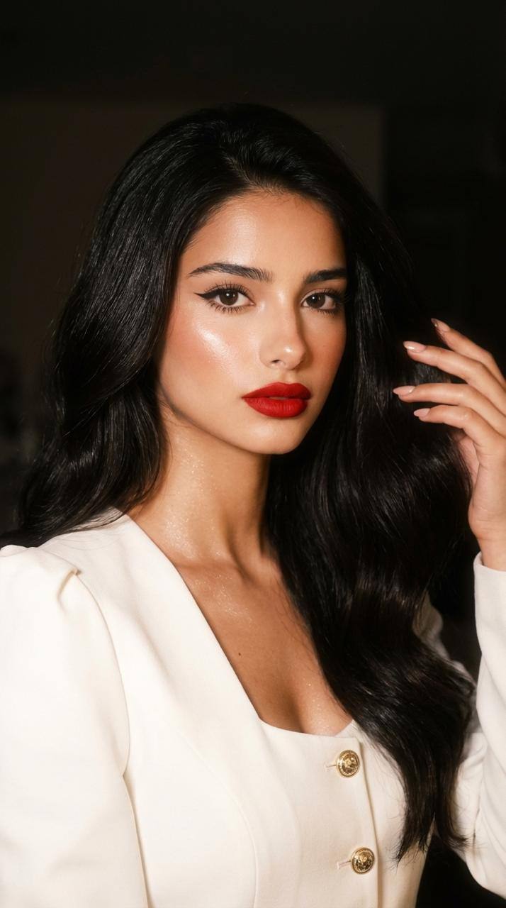 Небольшой шум на фото. Кинематографический портрет женщины, запрокинувшей голову к камере в эффектной позе через плечо. Минималистичный фон, мягко размытый в теплых нейтральных тонах, подчеркивает черты лица и движение волос. Тело модели повернуто в сторону, а взгляд возвращается к камере, создавая напряжение и элегантность. струящиеся волосы естественно ниспадают на одну сторону лица, частично закрывая один глаз, создавая загадочный эффект, характерный для журнальных съемок. Одежда: мягкая фактурная белая трикотажная вещь, мягко накинутая на плечи, создающая контраст с темными волосами и теплыми тонами кожи. Макияж в стиле «чистый люкс»: мягко очерченные скулы, мягкий бронзовый контур, удлиненные ресницы, тонкая подводка для глаз, естественный сатиновый оттенок кожи и приглушенные розово-нюдовые губы. Ракурс камеры: крупный портретный кадр, сфокусированный на лице и верхней части плеч, малая глубина резкости, изолирующая модель от фона. Освещение: направленный мягкий студийный свет сбоку, создающий мягкое затухание теней и кинематографическую выразительность лица. Мягко очерченное лицо, румяные щеки, блестящие губы, четко очерченные брови. Нейтральное теплое освещение с легкой вспышкой фронтальной камеры смартфона, сбалансированные тени. Изображение взято за образец. Добавлена мелкая пленочная зернистость, реалистичные поры кожи, легкое свечение. Стиль «чистой девушки» в духе Pinterest в сочетании с роскошной атмосферой пустыни, стиль лайфстайл-фотографий, сверхдетализация, качество 8K. Сильное Затемнение и понижение экспозиции по всему фото, солнечный луч на глазах, подчеркивает цвет, размытие с эффектом движения