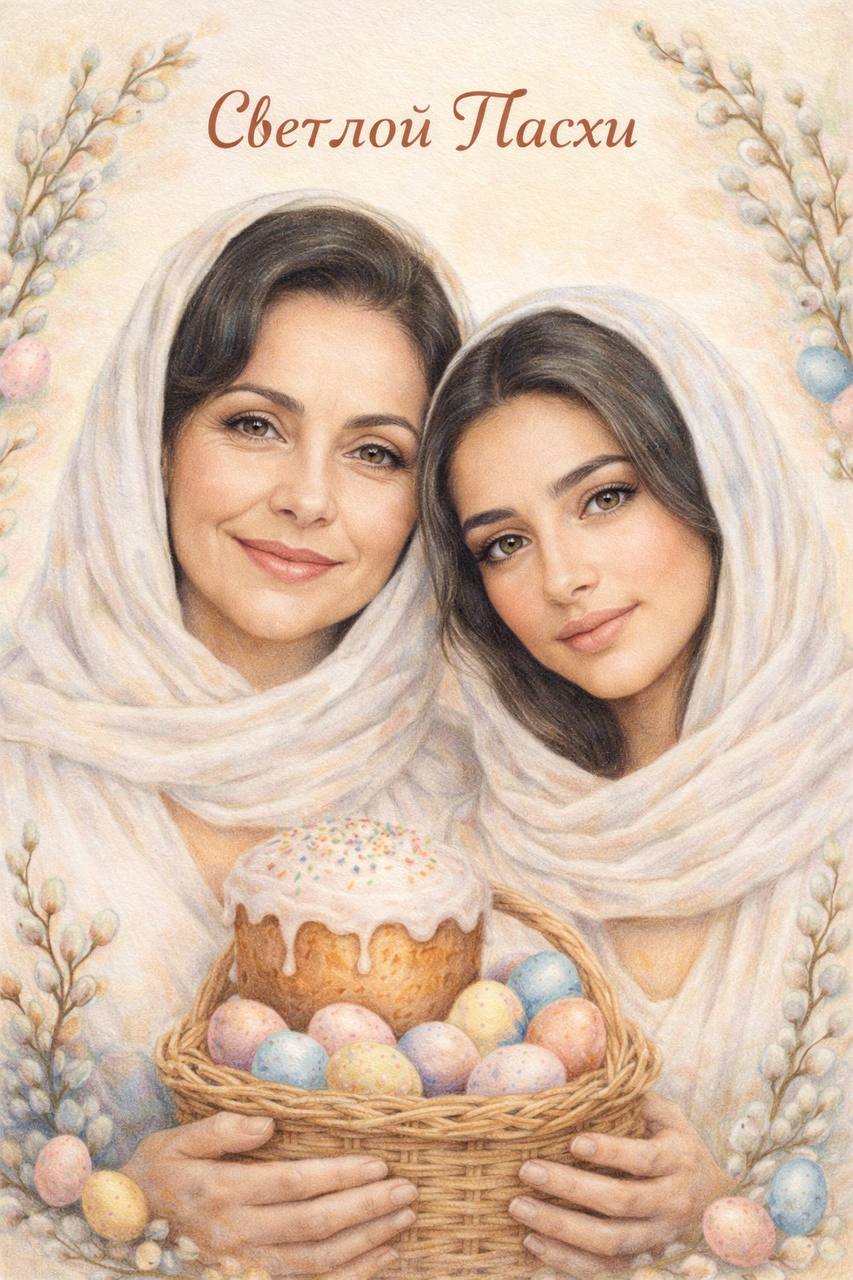 Композиция:девушка повернута к зрителю с тёплой улыбкой, рядом девочка с похожими мягкими чертами лица. Обе в белых шифоновых платьях и тонких лёгких белых платках, аккуратно накинутых вокруг головы и шеи.В руках корзинка с пасхальными яйцами и веточками вербы.Фон:светлый пастельный, мягкое свечение.По краям веточки вербы и маленькие пасхальные яйца.Текст сверху:«Светлой Пасхи».